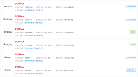 此外,在2018年字节跳动刚刚涉水金融业务时,还同步申请了“多闪支付”、“多闪付”、“多闪钱包”等多个支付服务相关商标。另一方面,字节跳动去年被曝已经拿下douyinpay.com域名。对此字节跳动方面回应称,是为防止第三方恶意侵权。