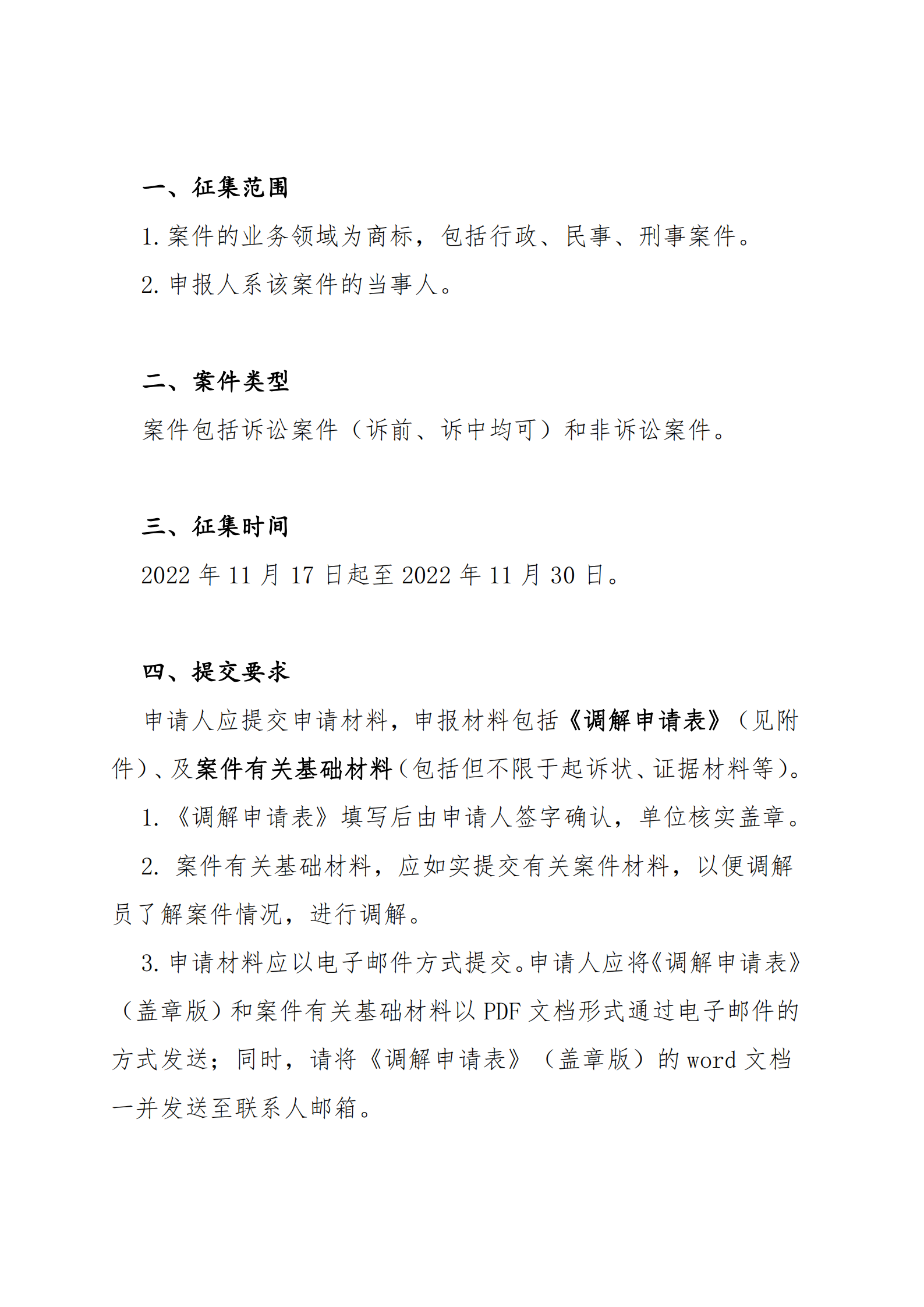 3.申请材料应以电子邮件方式提交。申请人应将《调解申请表》(盖章版)和案件有关基础材料以PDF文档形式通过电子邮件的方式发送;同时,请将《调解申请表》(盖章版)的word文档一并发送至联系人邮箱。