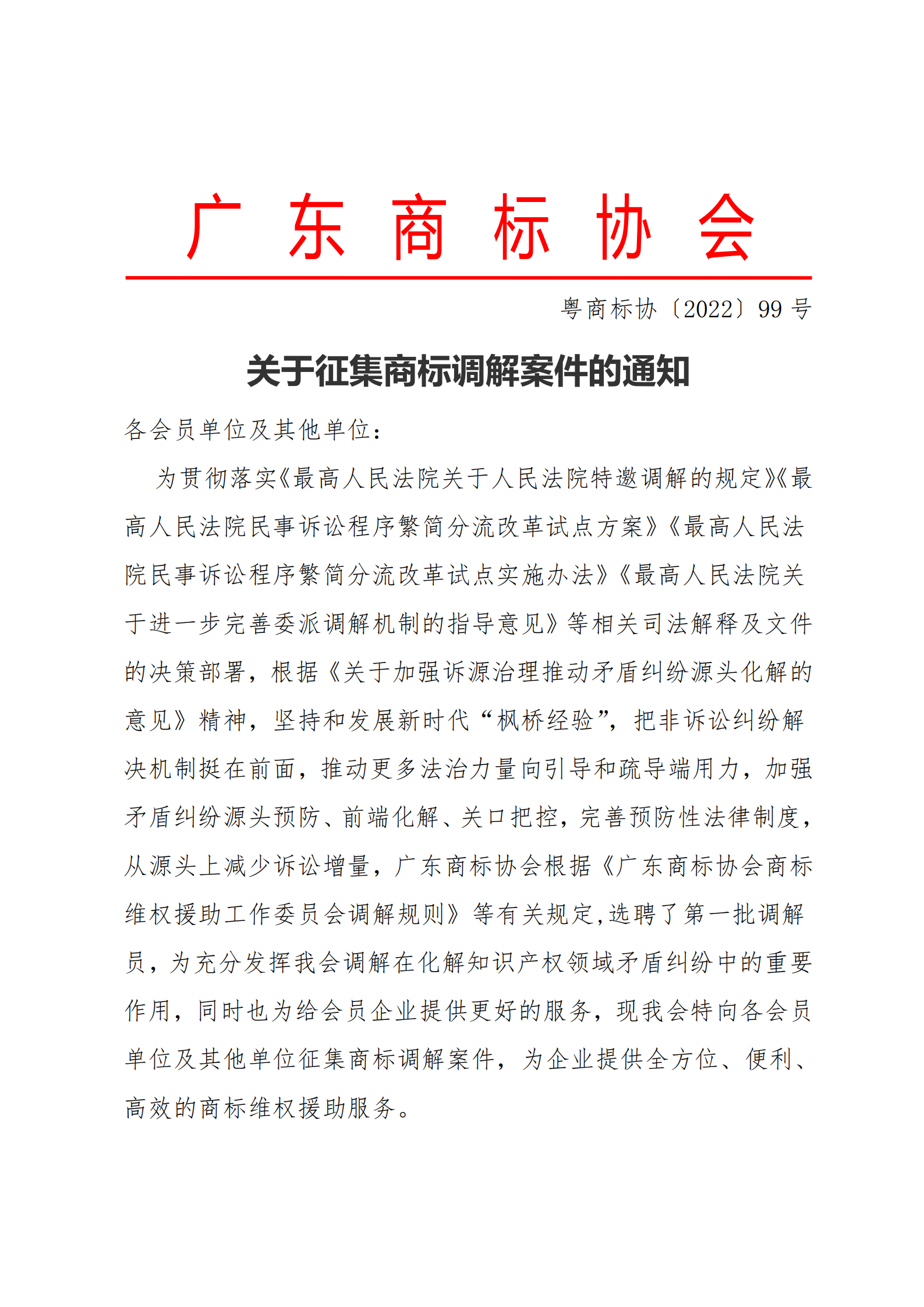 为贯彻落实《最高人民法院关于人民法院特邀调解的规定》《最高人民法院民事诉讼程序繁简分流改革试点方案》《最高人民法院民事诉讼程序繁简分流改革试点实施办法》《最高人民法院关于进一步完善委派调解机制的指导意见》等相关司法解释及文件的决策部署,根据《关于加强诉源治理推动矛盾纠纷源头化解的意见》精神,坚持和发展新时代“枫桥经验”,把非诉讼纠纷解决机制挺在前面,推动更多法治力量向引导和疏导端用力,加强矛盾纠纷源头预防、前端化解、关口把控,完善预防性法律制度,从源头上减少诉讼增量,广东商标协会根据《广东商标协会商标维权援助工作委员会调解规则》等有关规定,选聘了第一批调解员,为充分发挥我会调解在化解知识产权领域矛盾纠纷中的重要作用,同时也为给会员企业提供更好的服务,现我会特向各会员单位及其他单位征集商标调解案件,为企业提供全方位、便利、高效的商标维权援助服务。