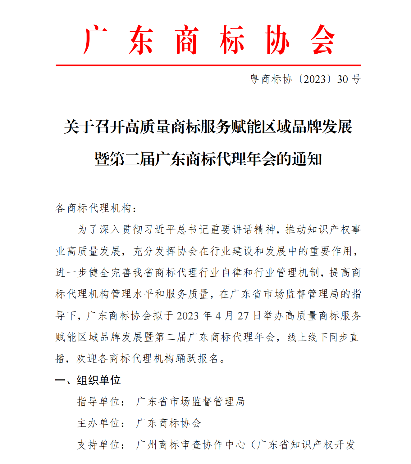 为了深入贯彻习近平总书记重要讲话精神,推动知识产权事业高质量发展,充分发挥协会在行业建设和发展中的重要作用,进一步健全完善我省商标代理行业自律和行业管理机制,提高商标代理机构管理水平和服务质量,在广东省市场监督管理局的指导下,广东商标协会拟于2023年4月27日举办高质量商标服务赋能区域品牌发展暨第二届广东商标代理年会,线上线下同步直播,欢迎各商标代理机构踊跃报名。