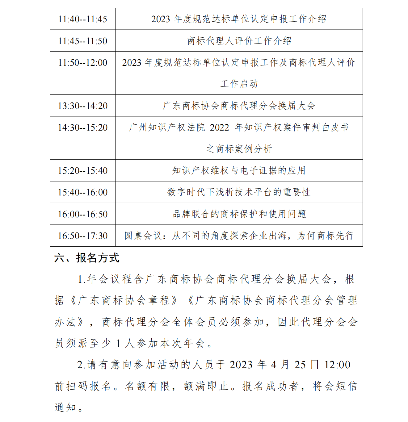 1.年会议程含广东商标协会商标代理分会换届大会,根据《广东商标协会章程》《广东商标协会商标代理分会管理办法》,商标代理分会全体会员必须参加,因此代理分会会员须派至少1人参加本次年会。