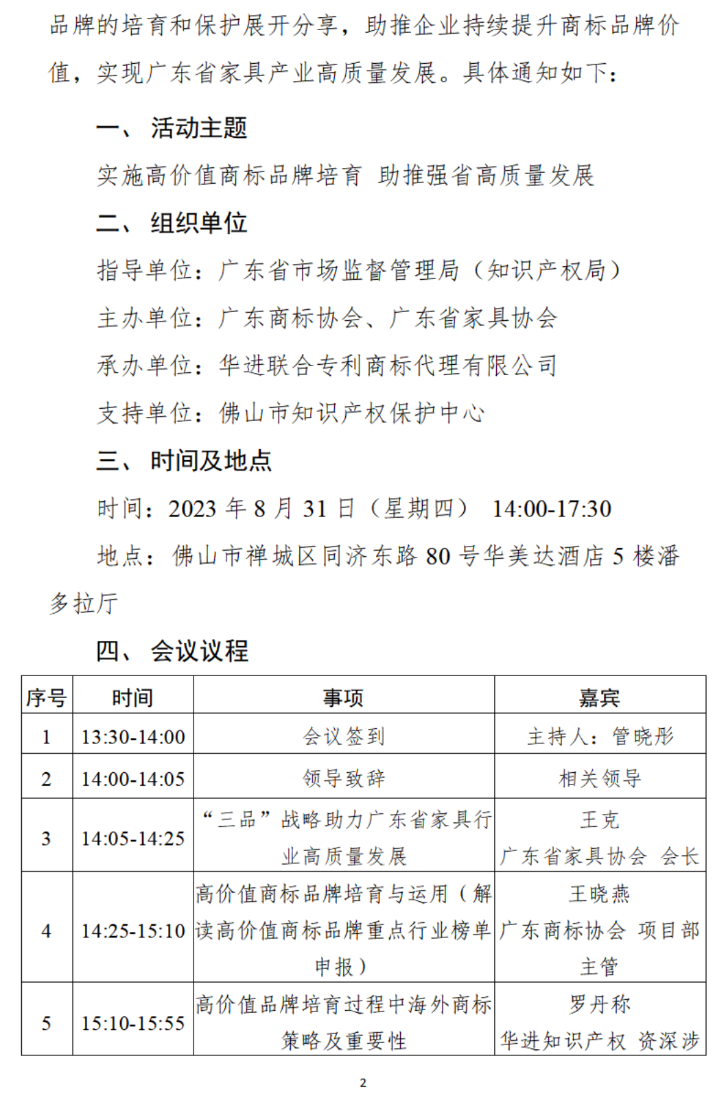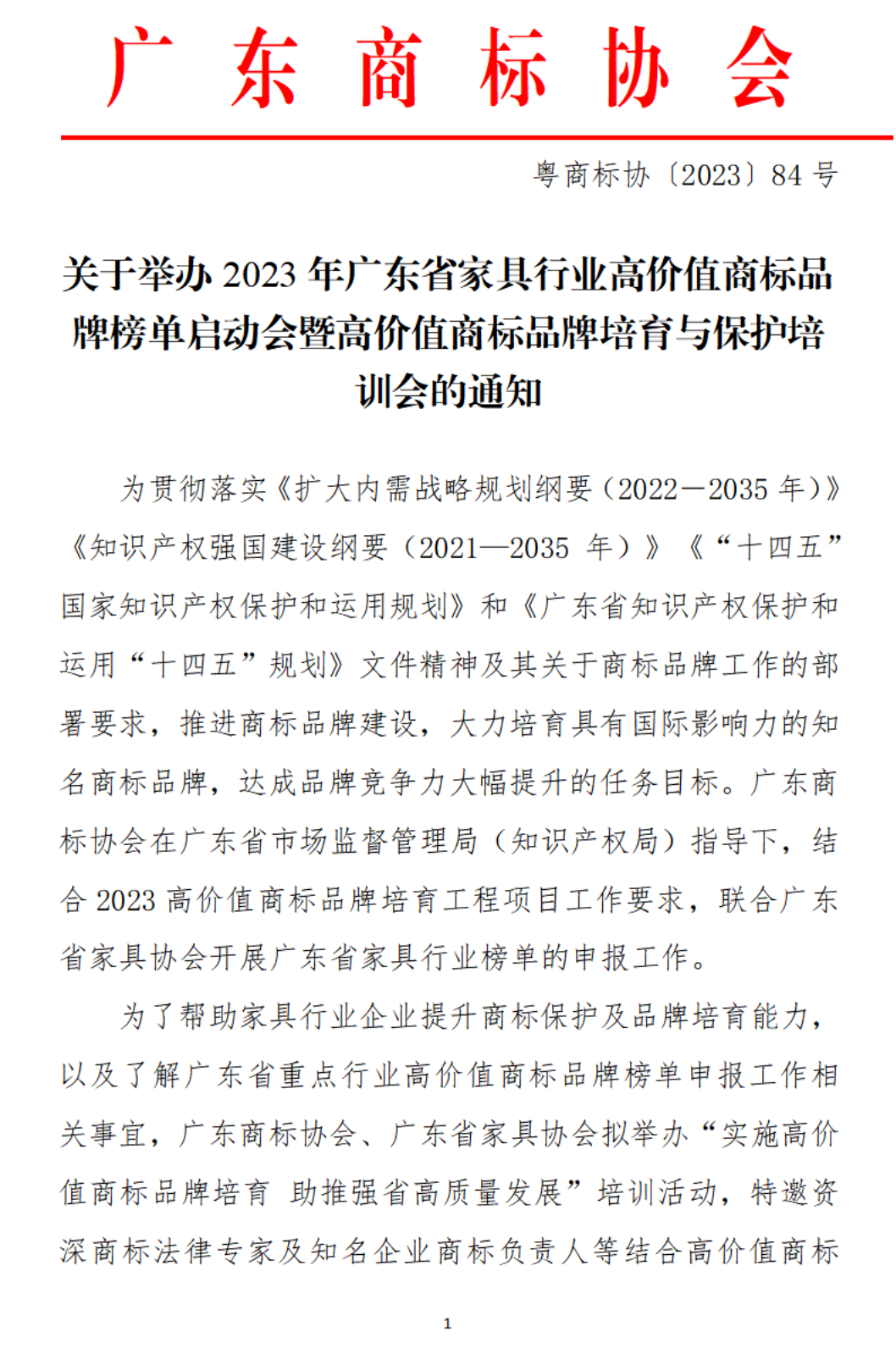 关于举办2023年广东省家具行业高价值商标品牌榜单启动会暨高价值商标品牌培育与保护培训会的通知