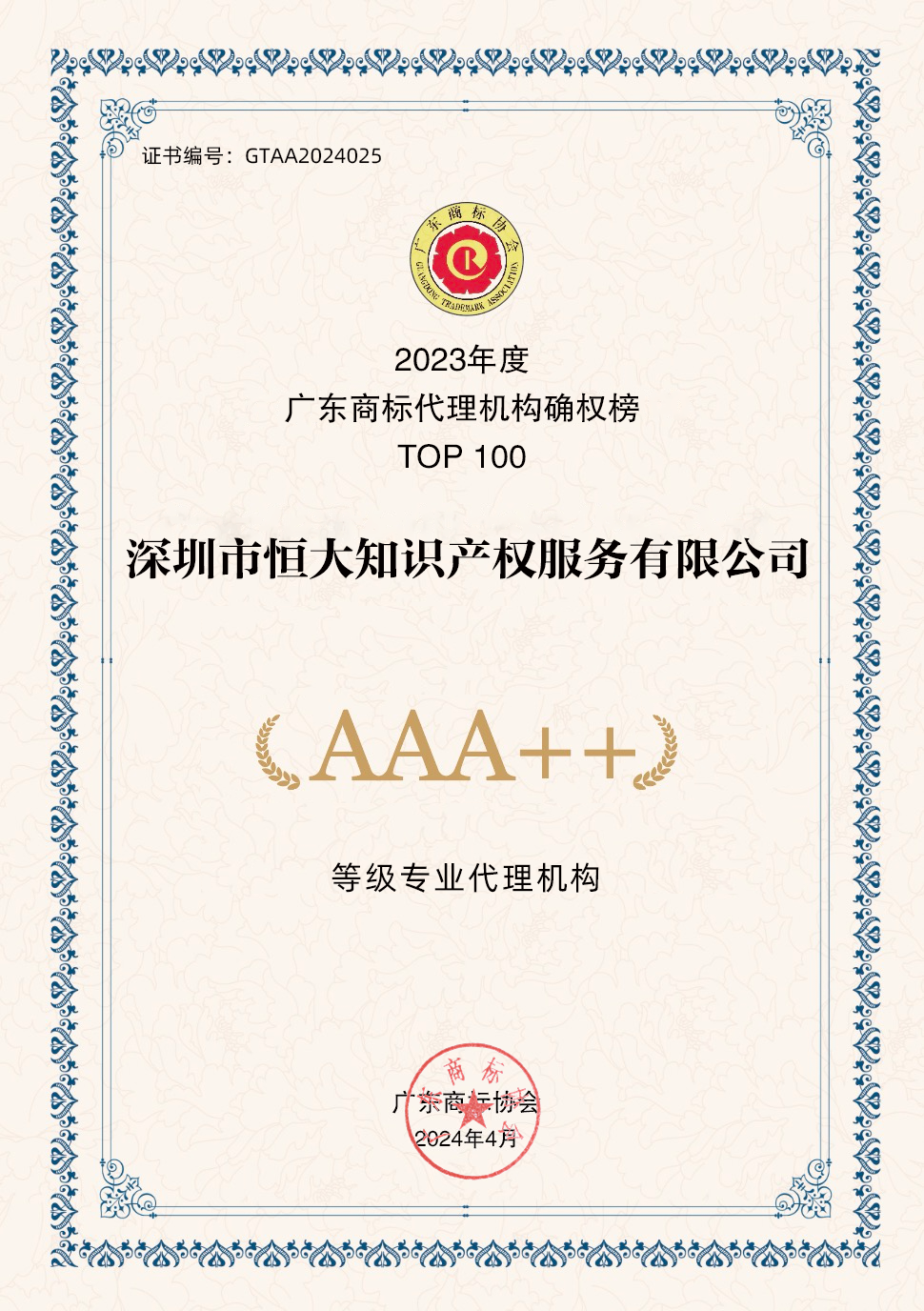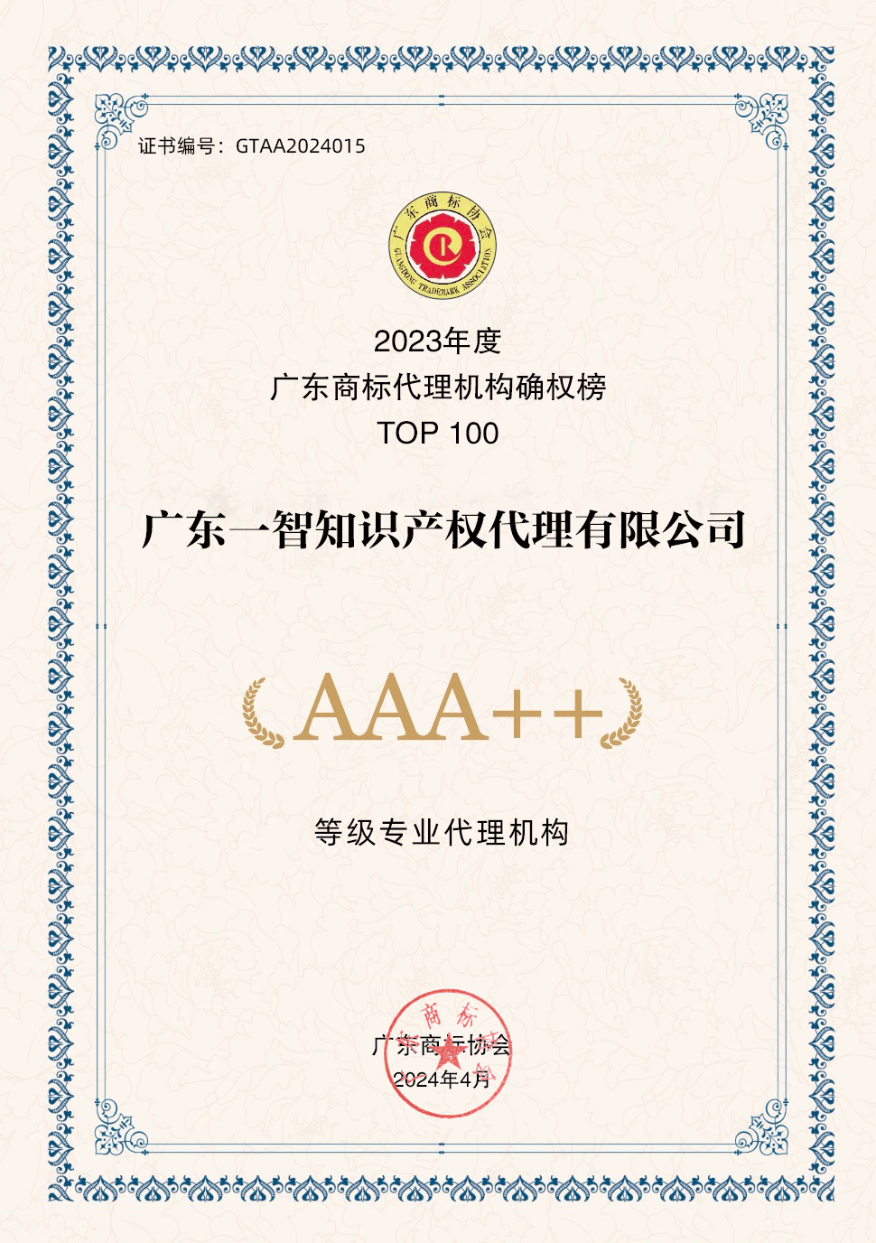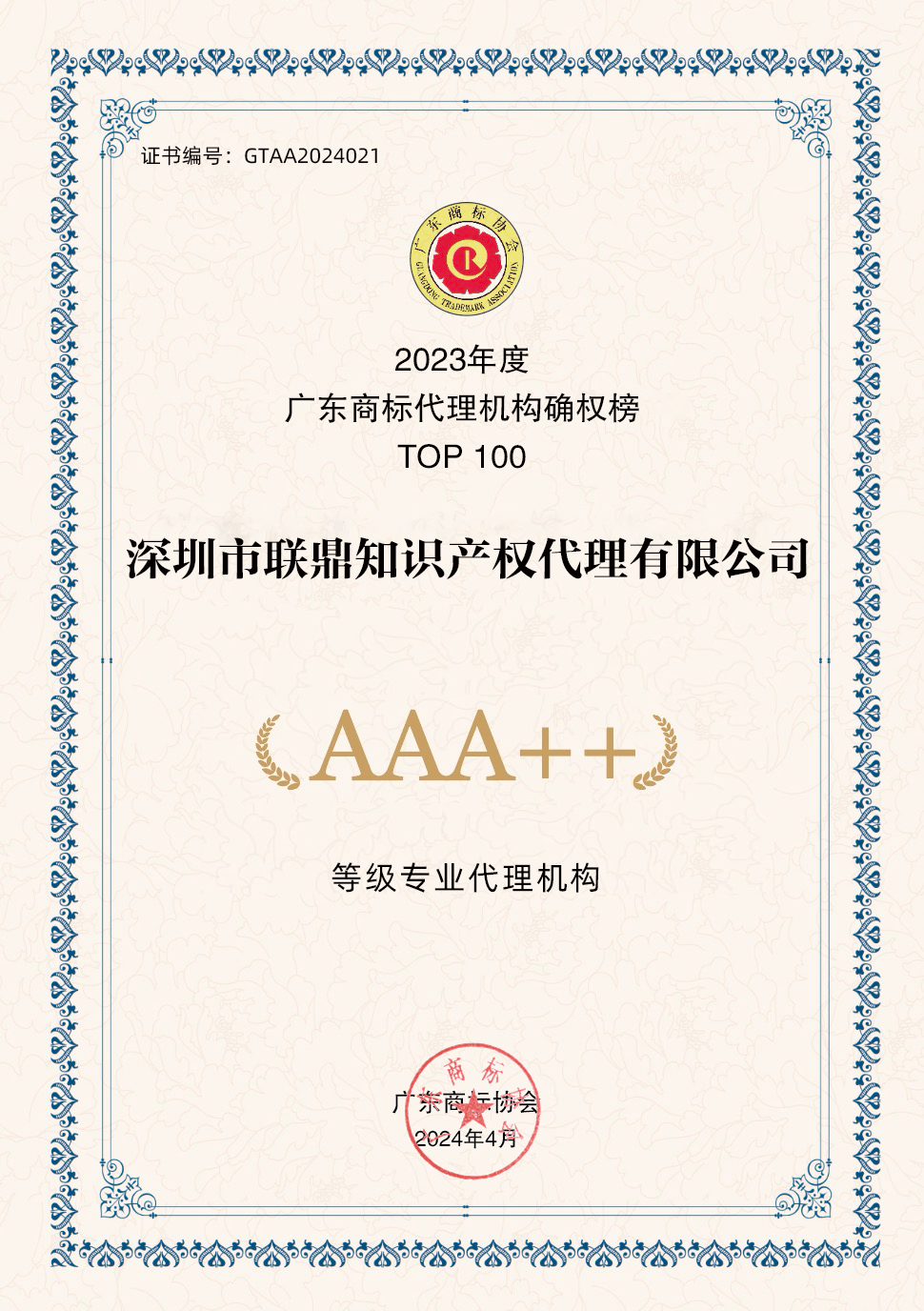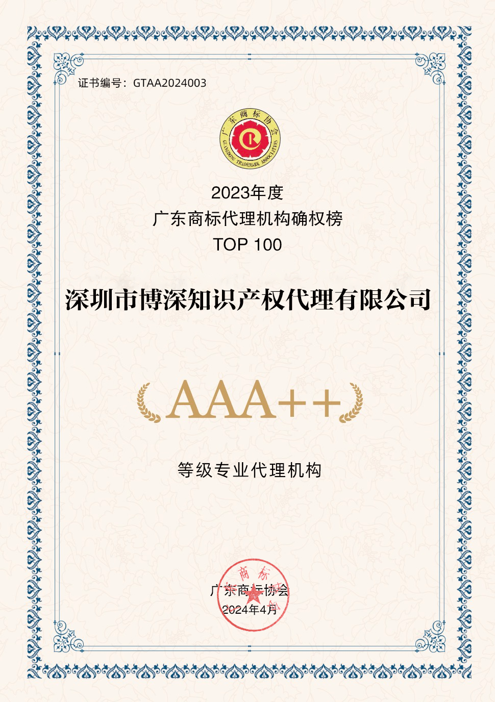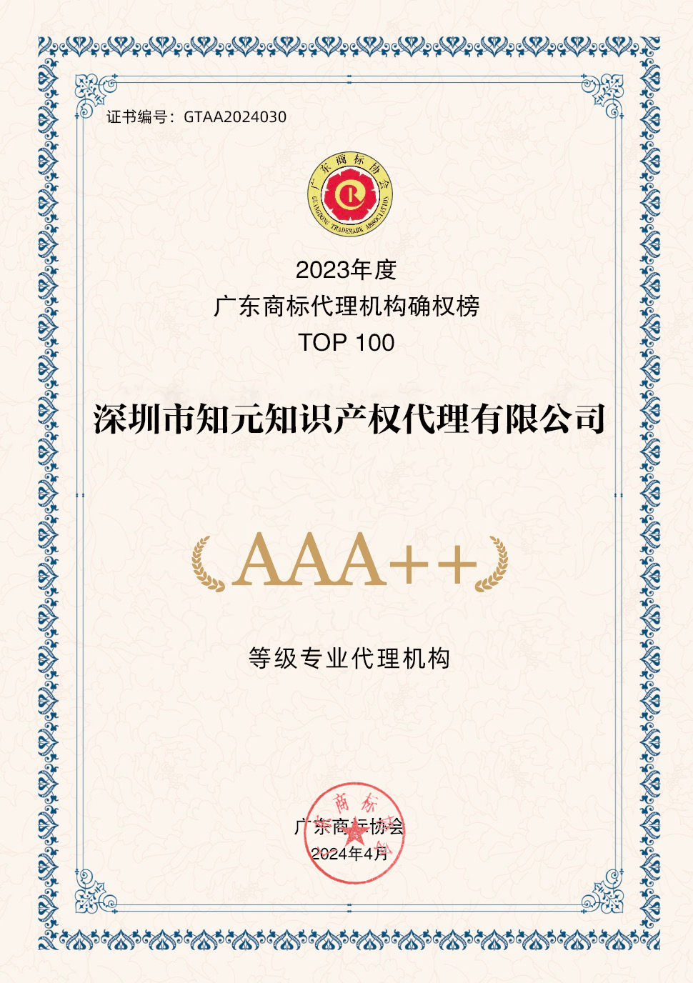 2023年度广东商标代理机构确权榜TOP100-AAA++前30家证书下载