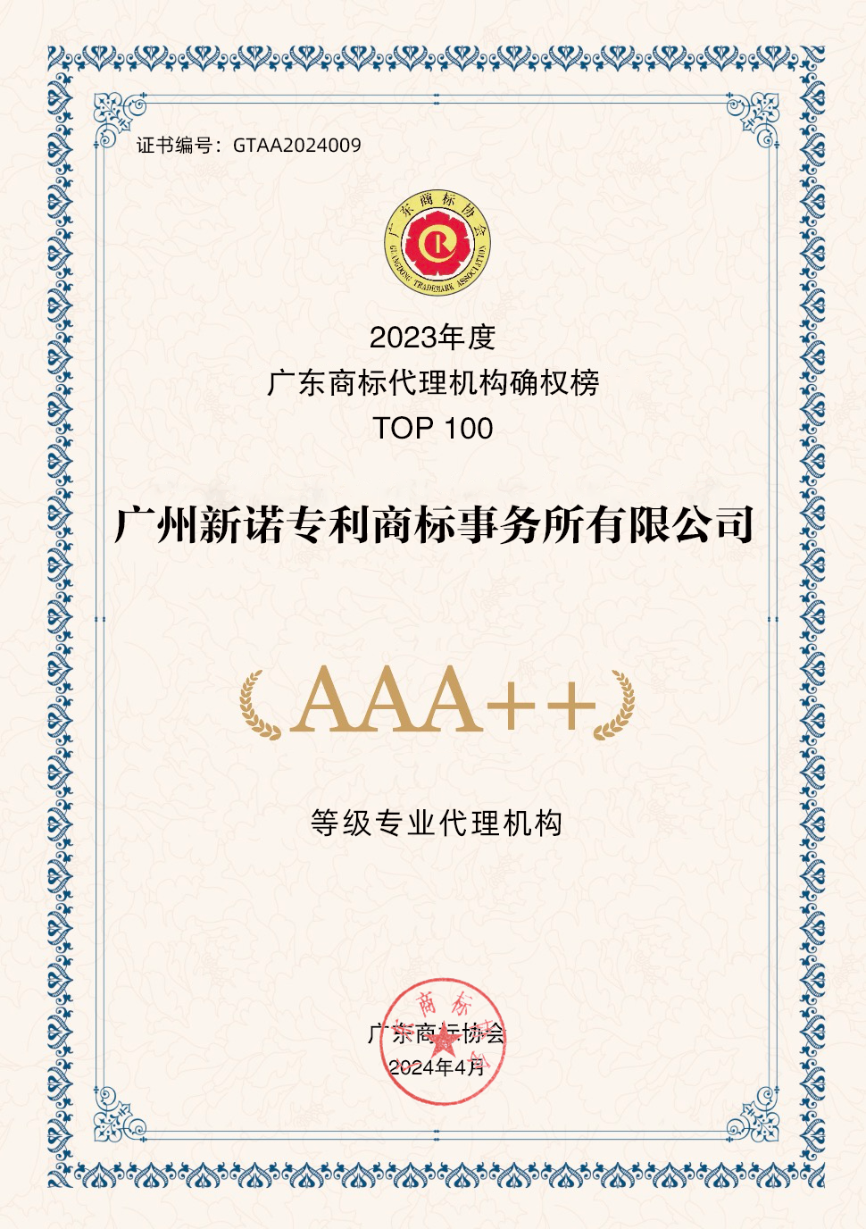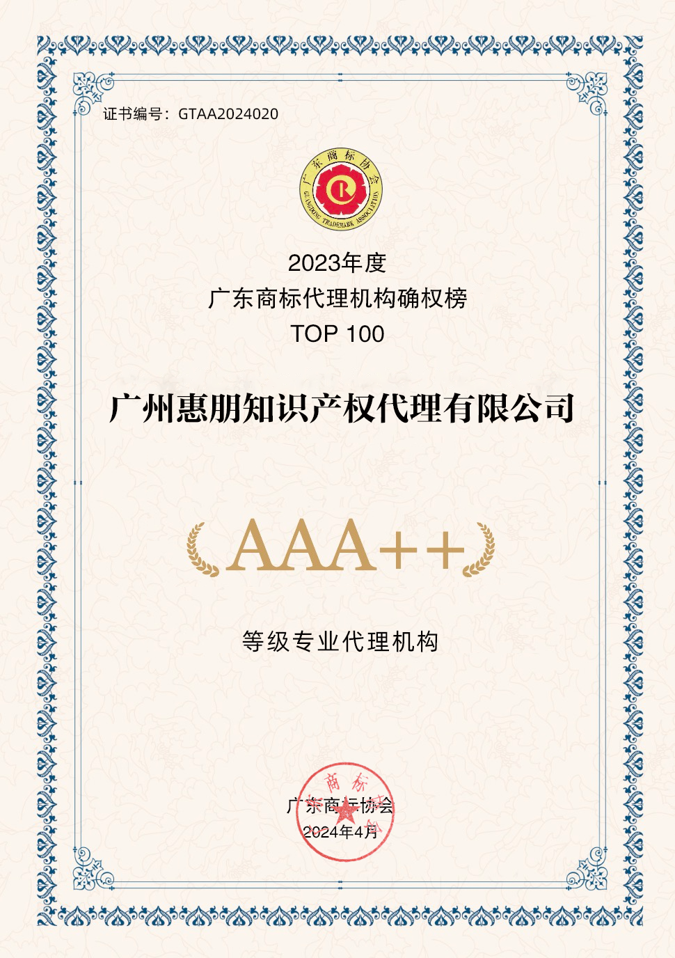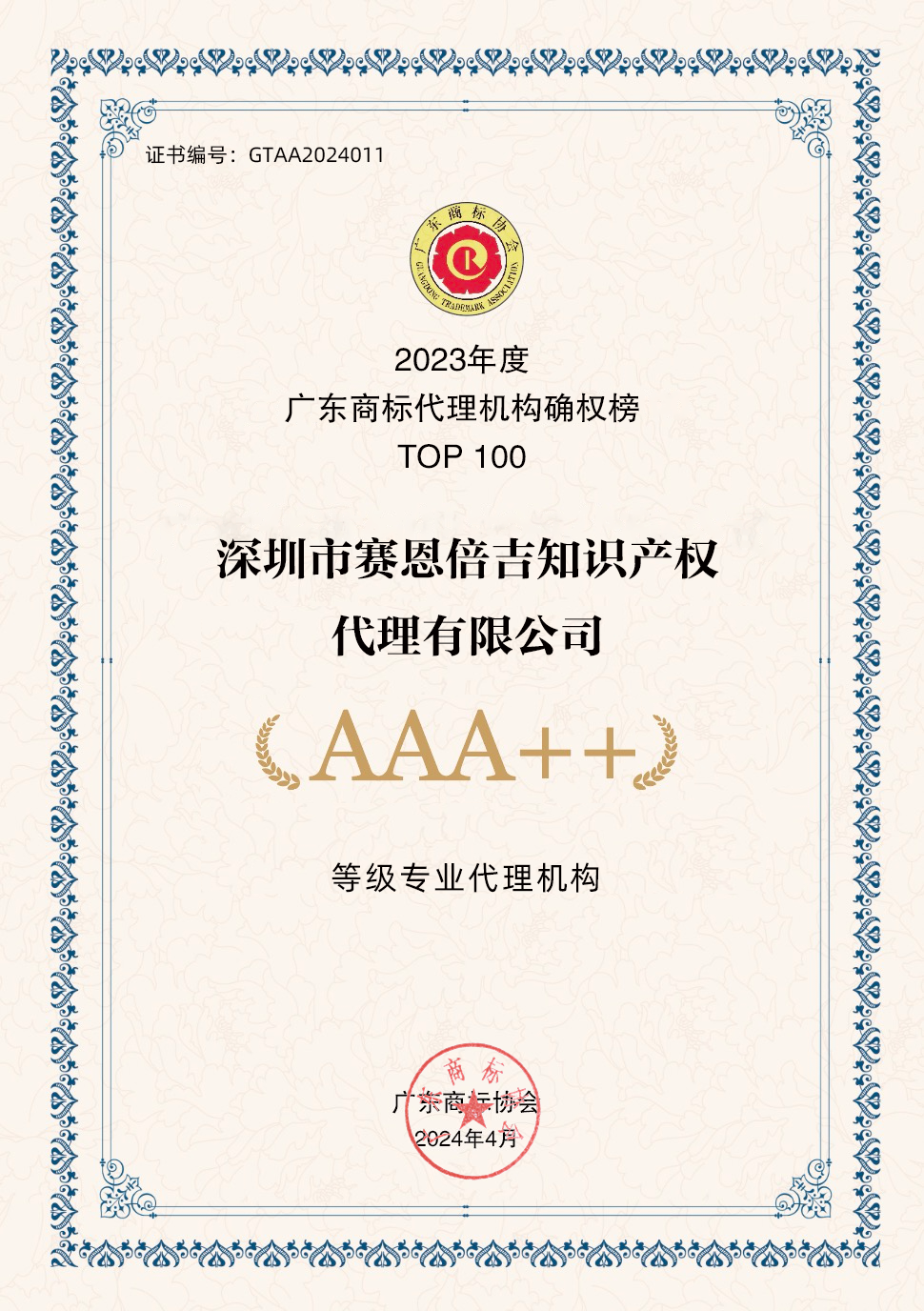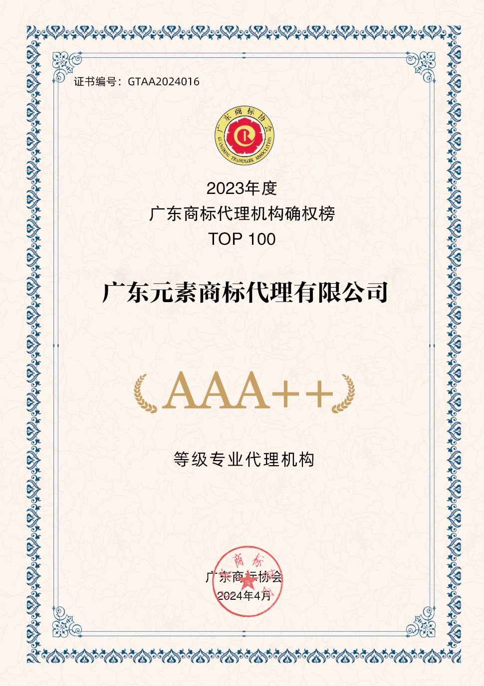 2023年度广东商标代理机构确权榜TOP100-AAA++前30家证书下载