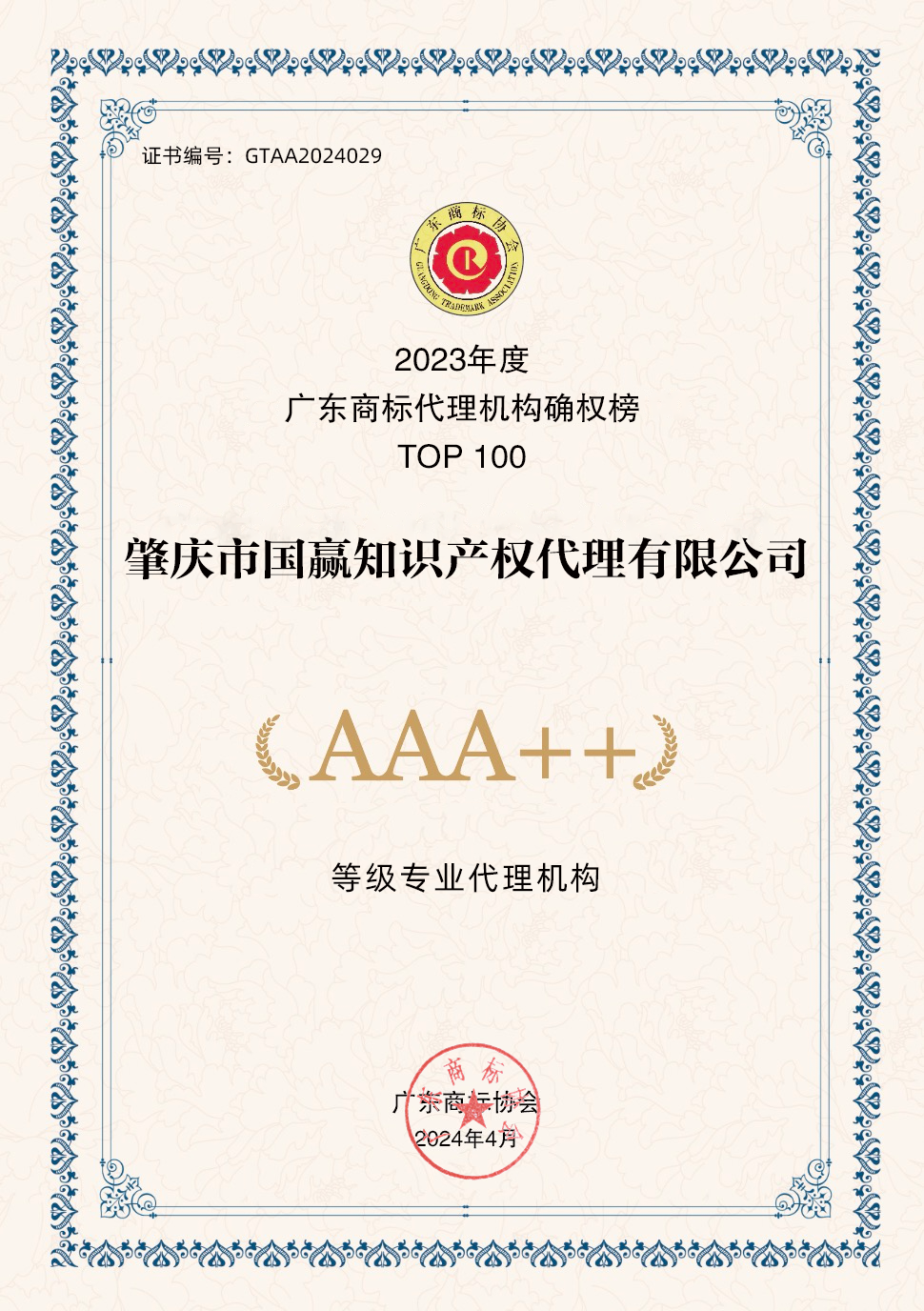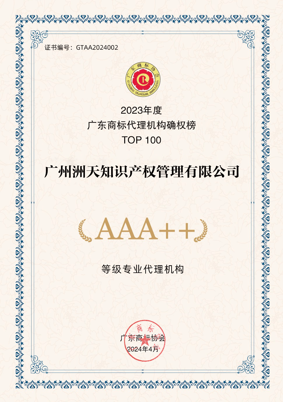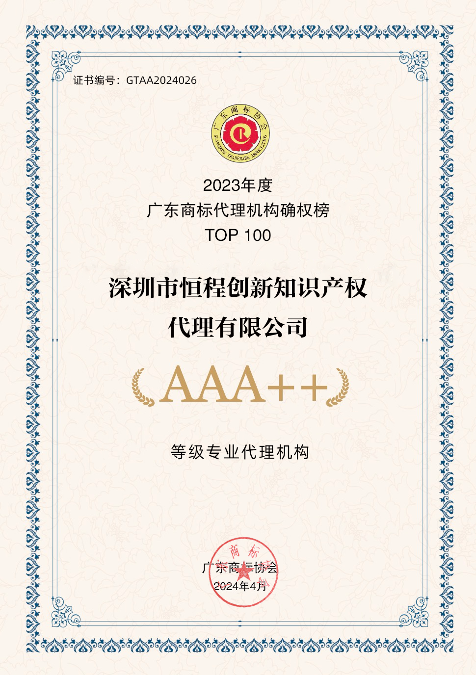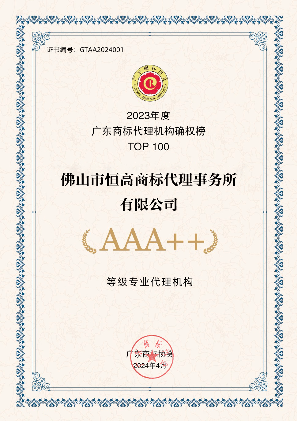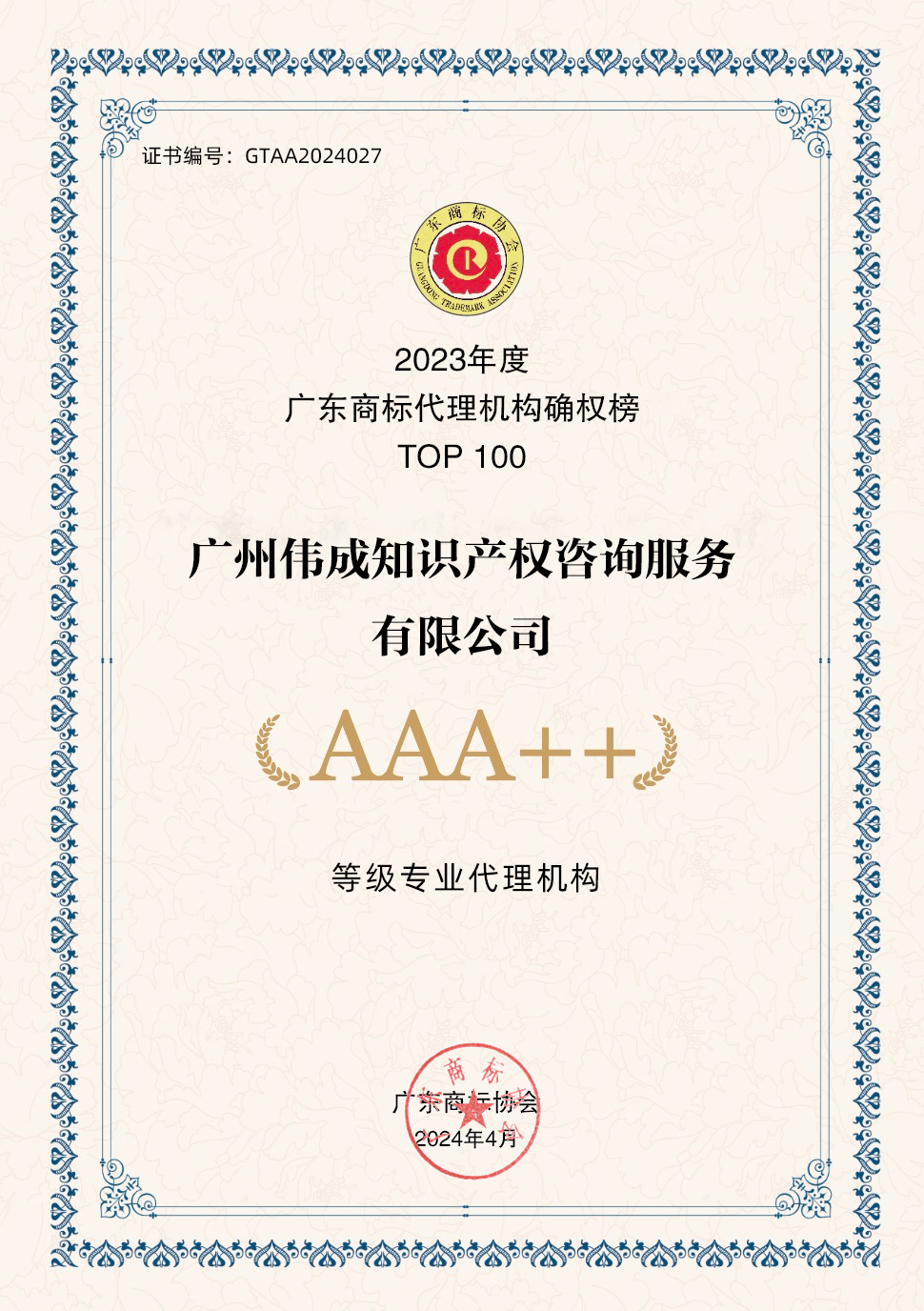 2023年度广东商标代理机构确权榜TOP100-AAA++前30家证书下载