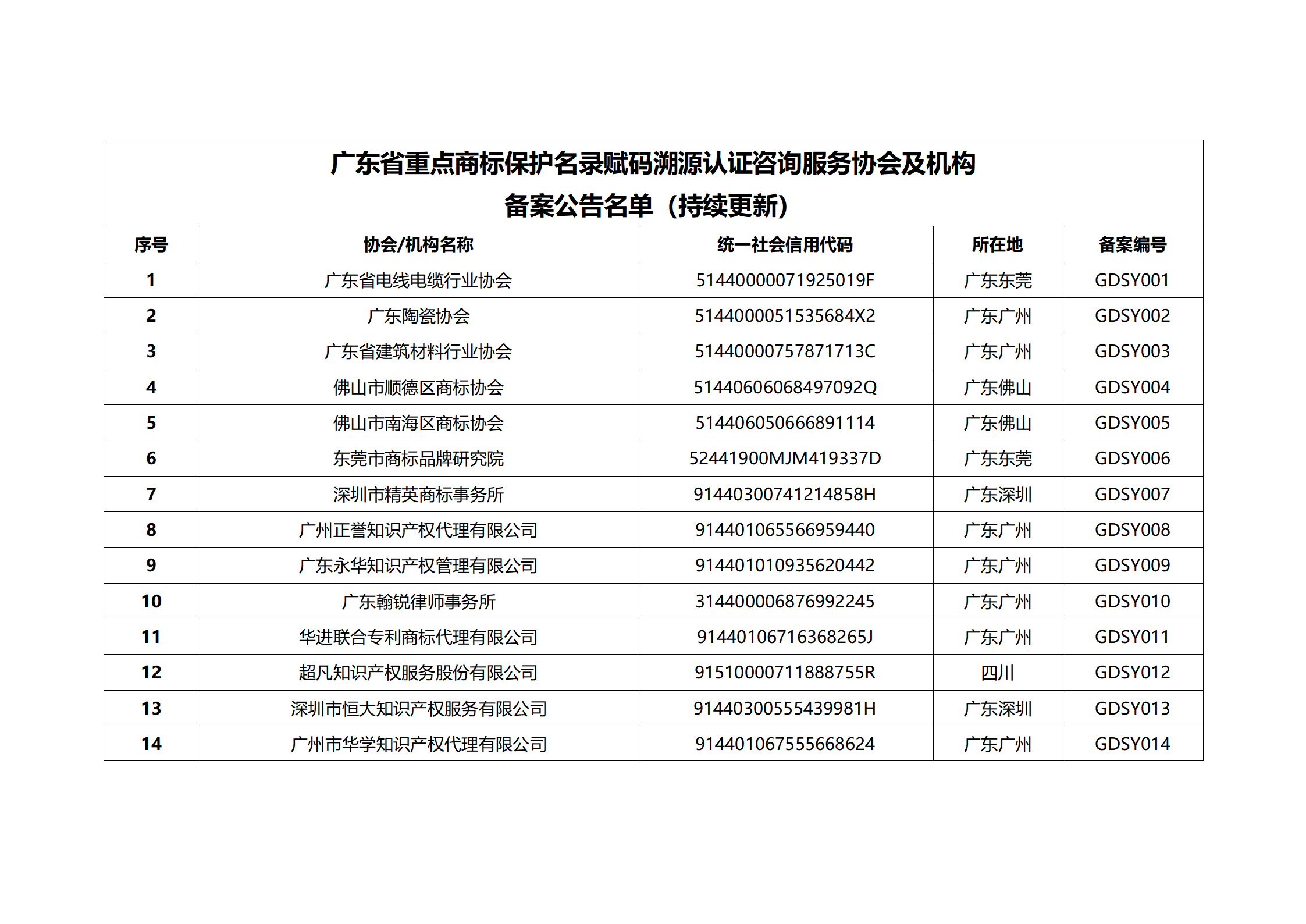 广东省重点商标保护名录赋码溯源认证管理授权咨询服务协会及机构备案公告.pdf