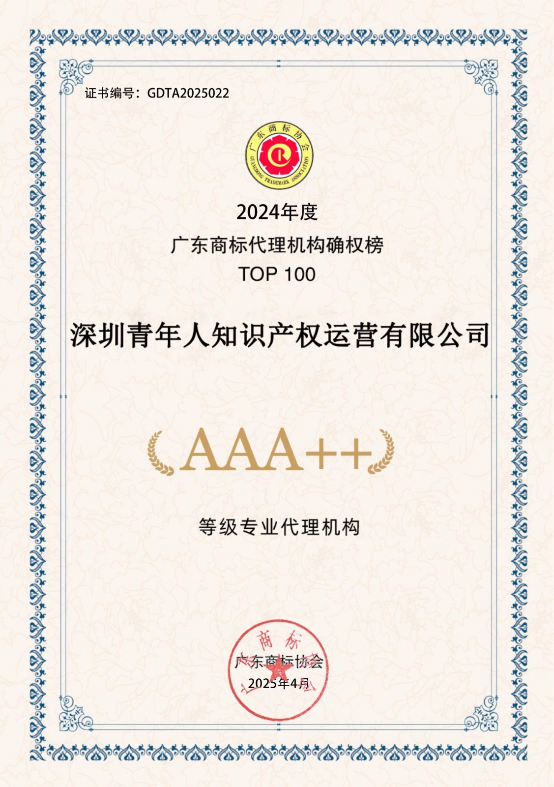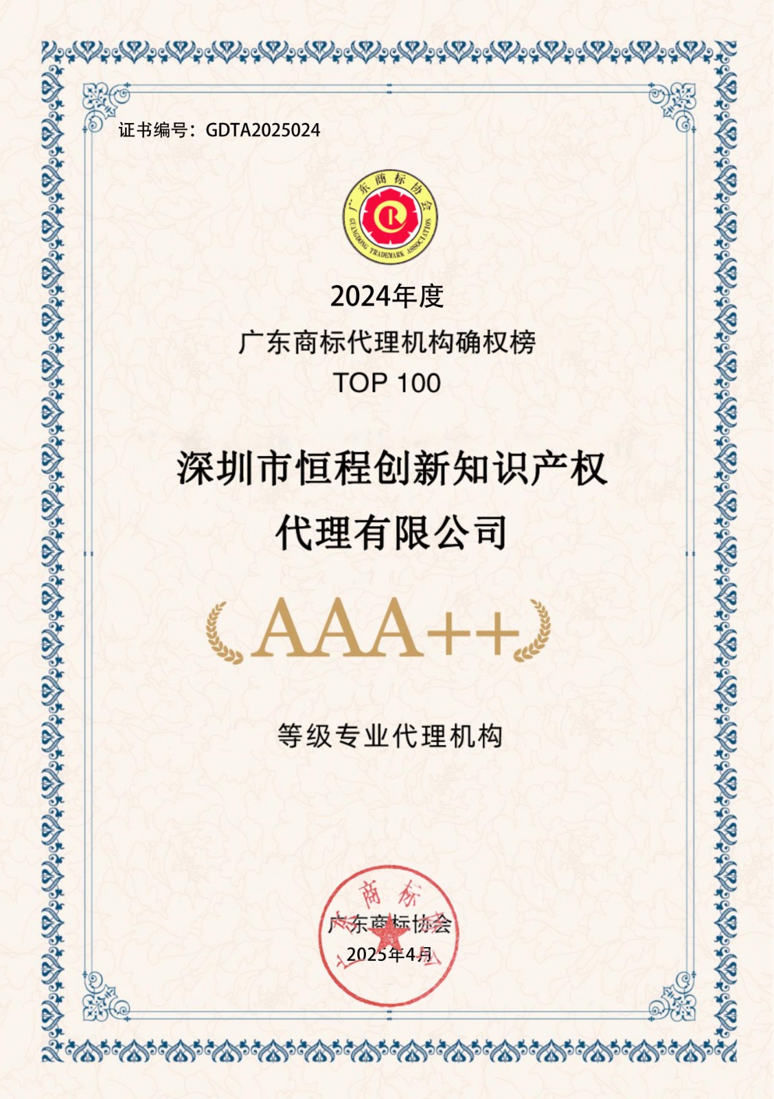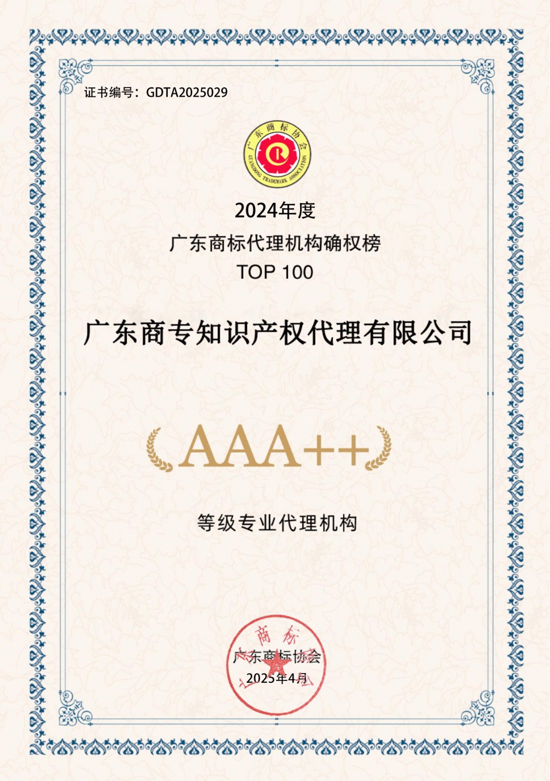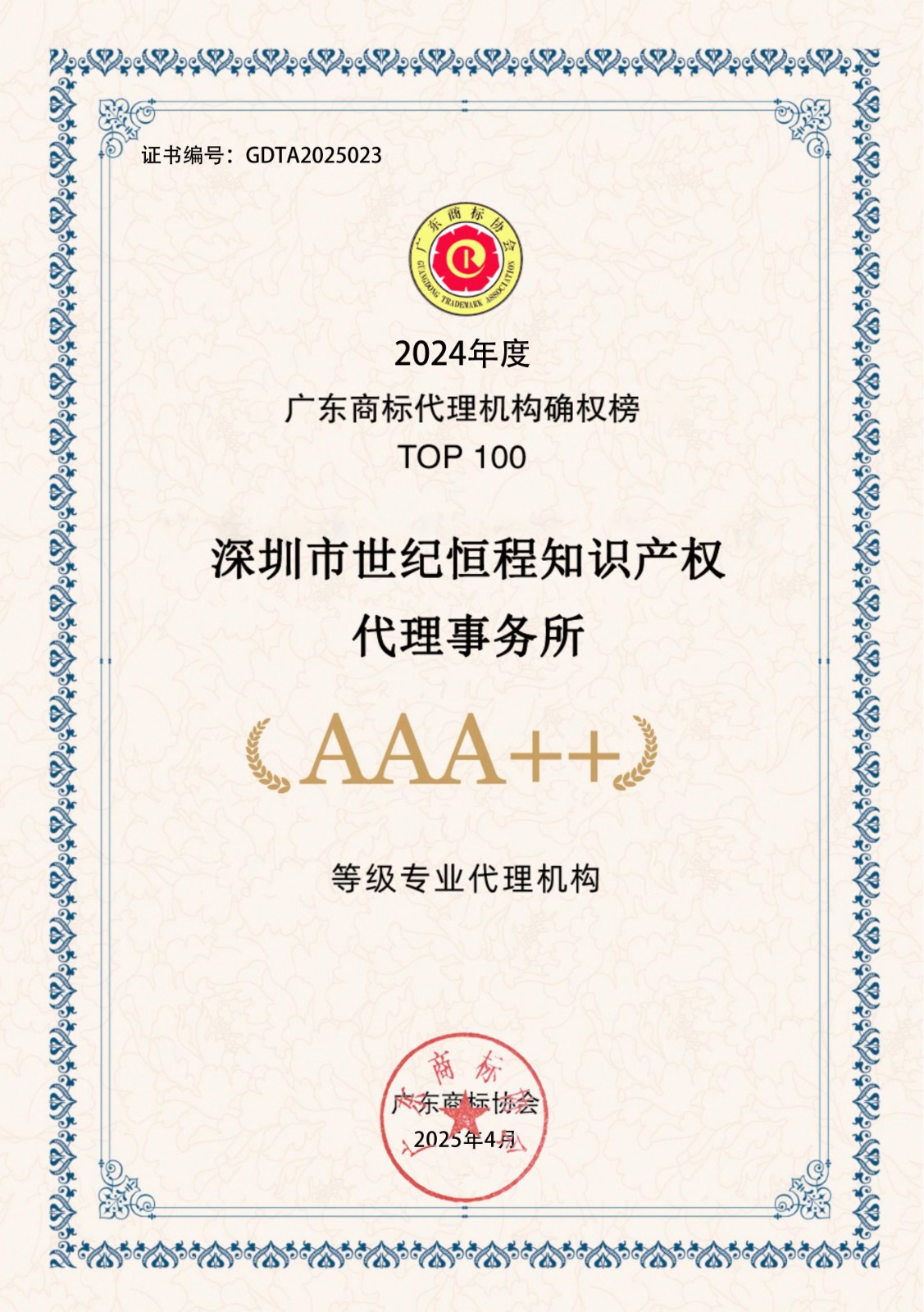 2024年度广东商标代理机构确权榜TOP100-AAA++30家证书下载