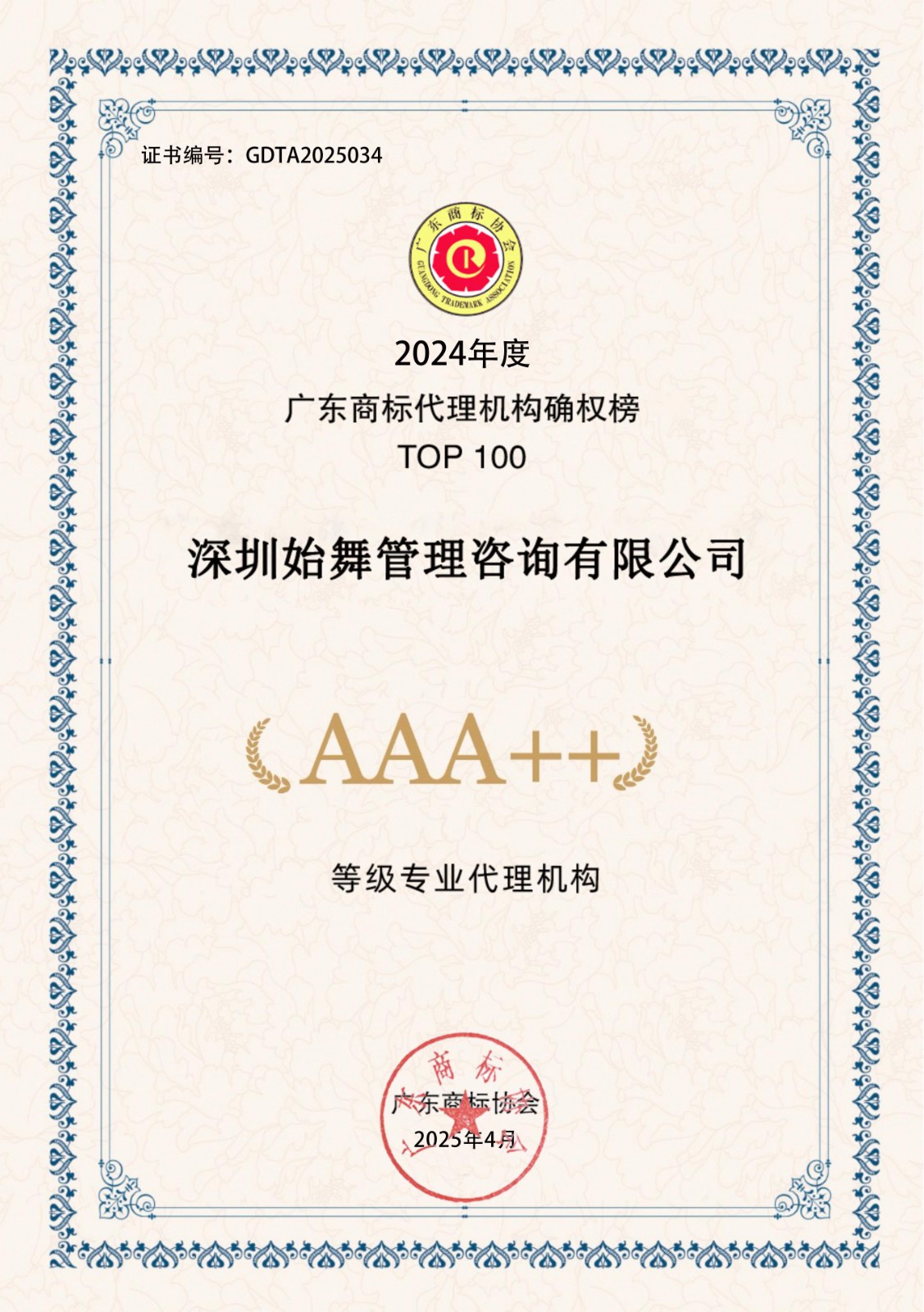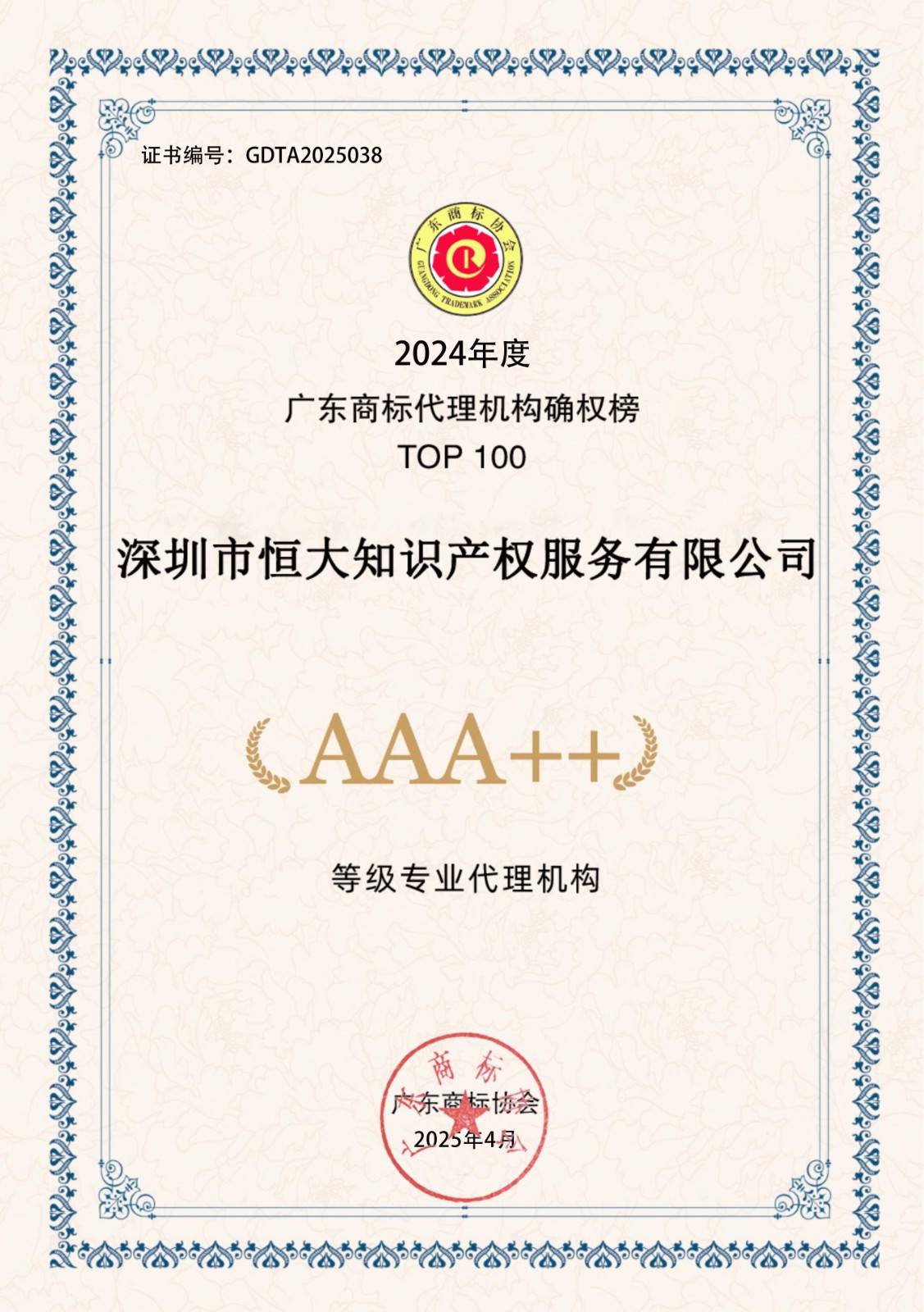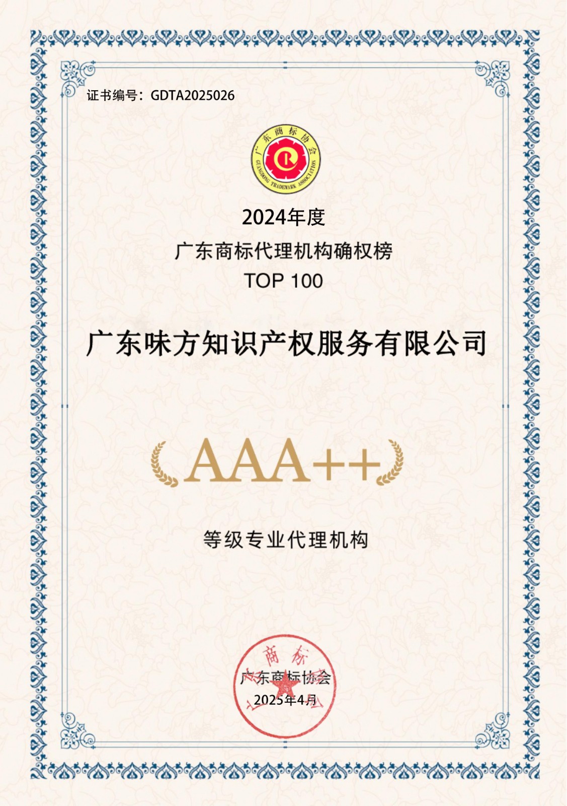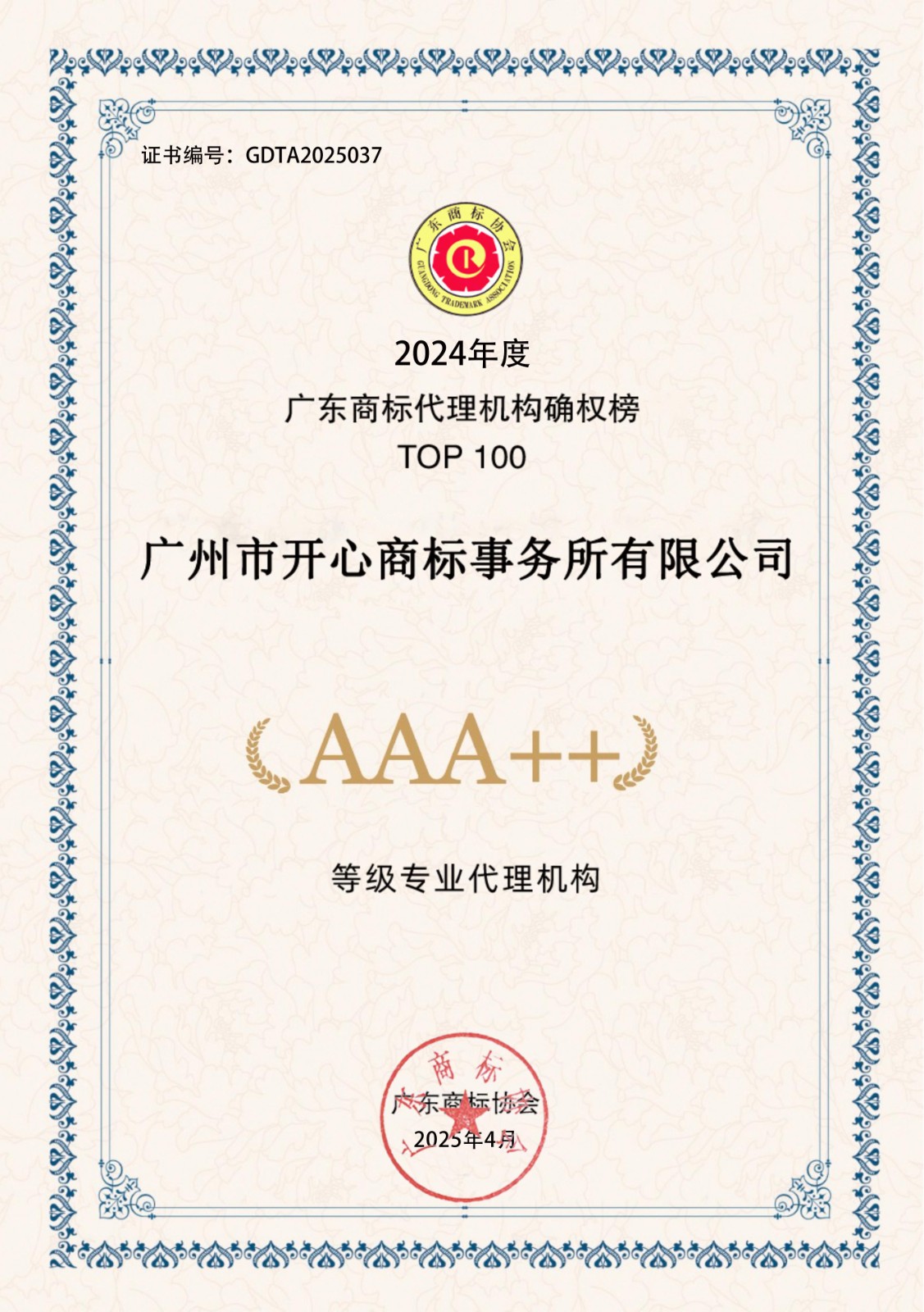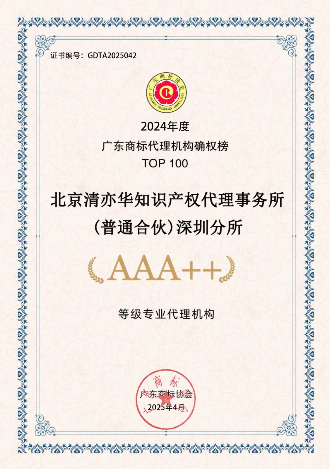 2024年度广东商标代理机构确权榜TOP100-AAA++30家证书下载
