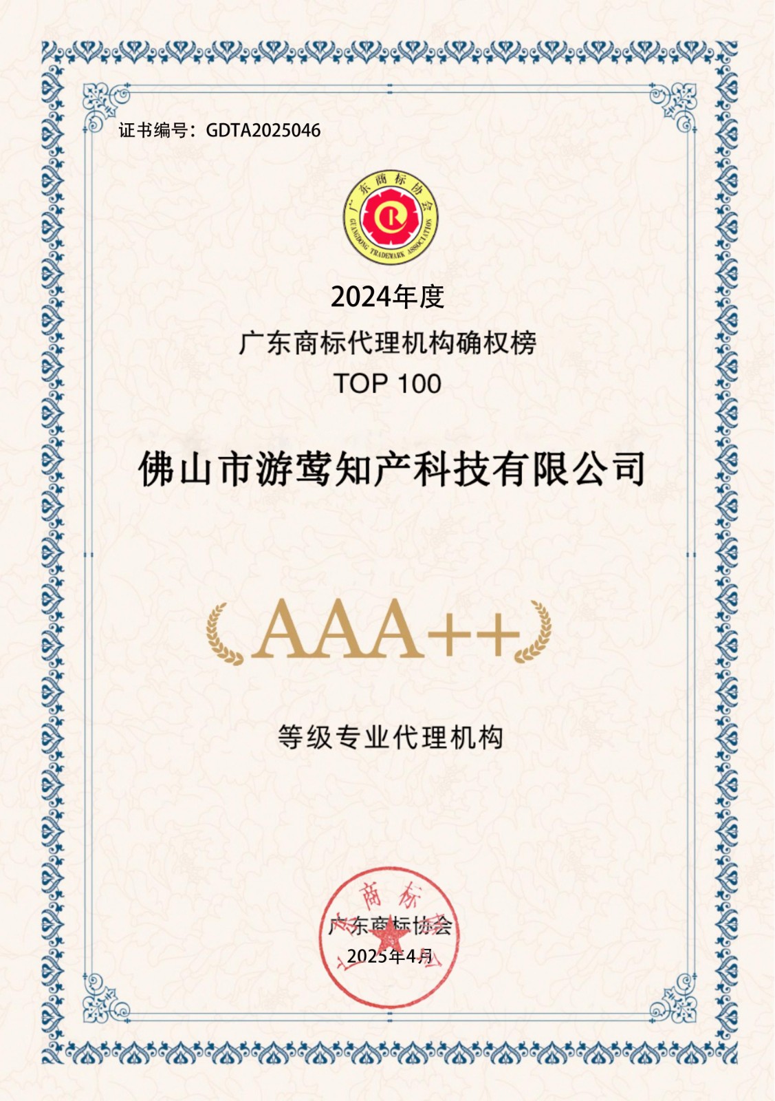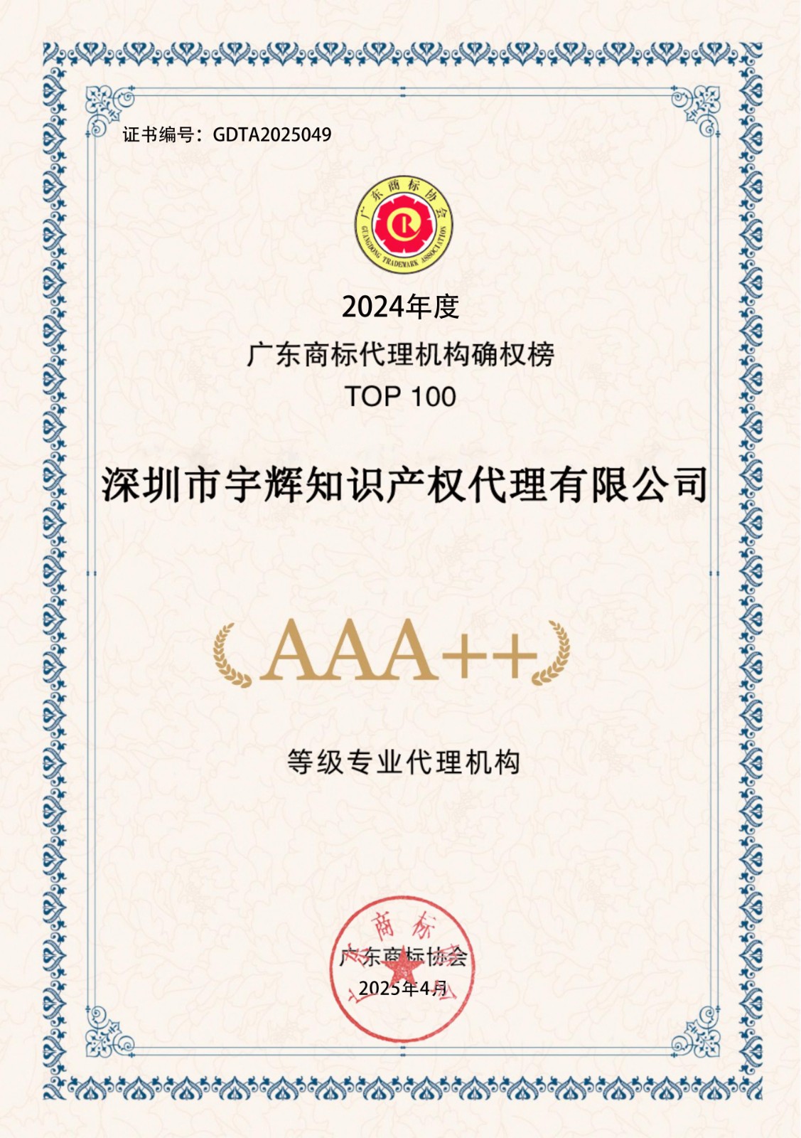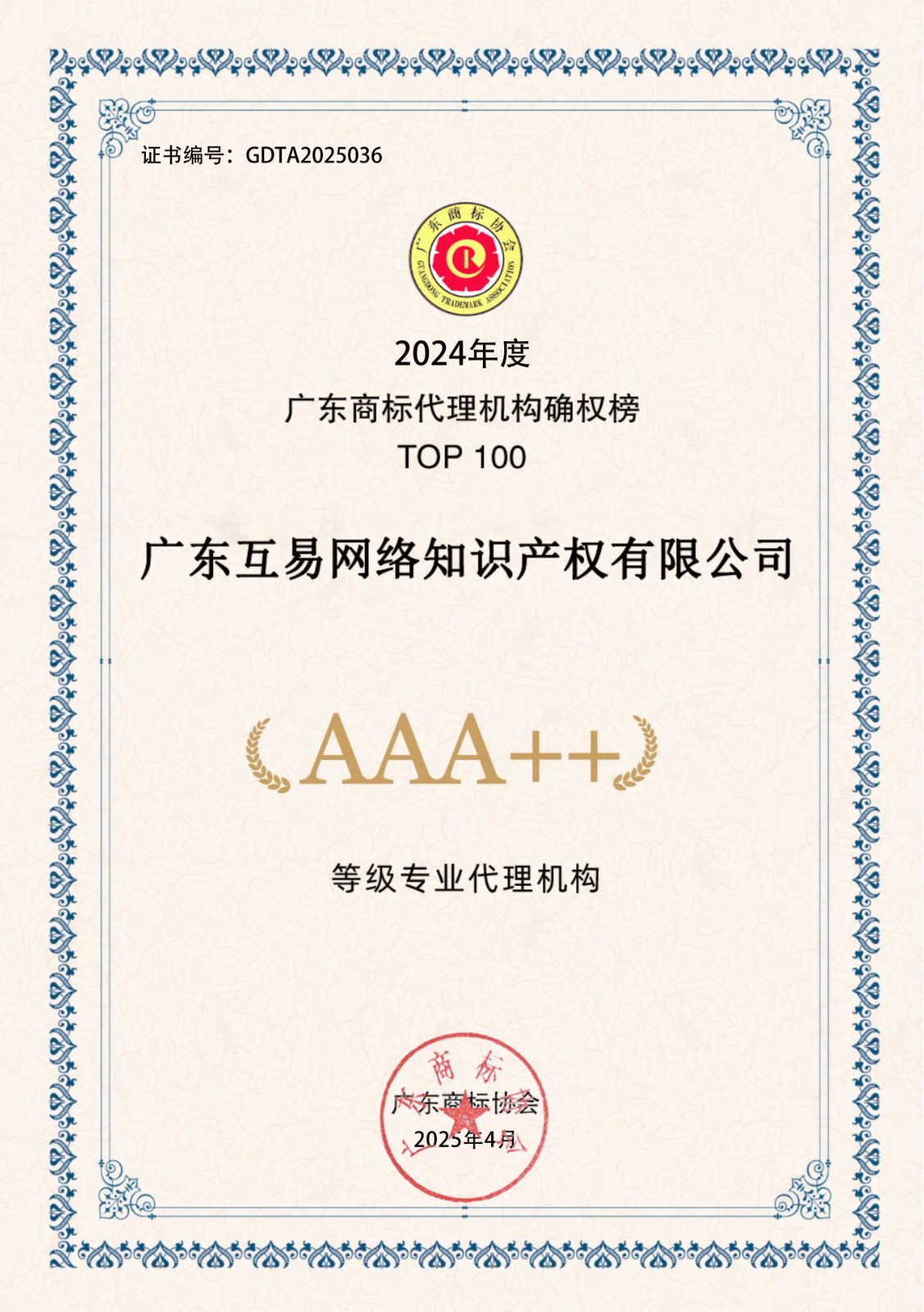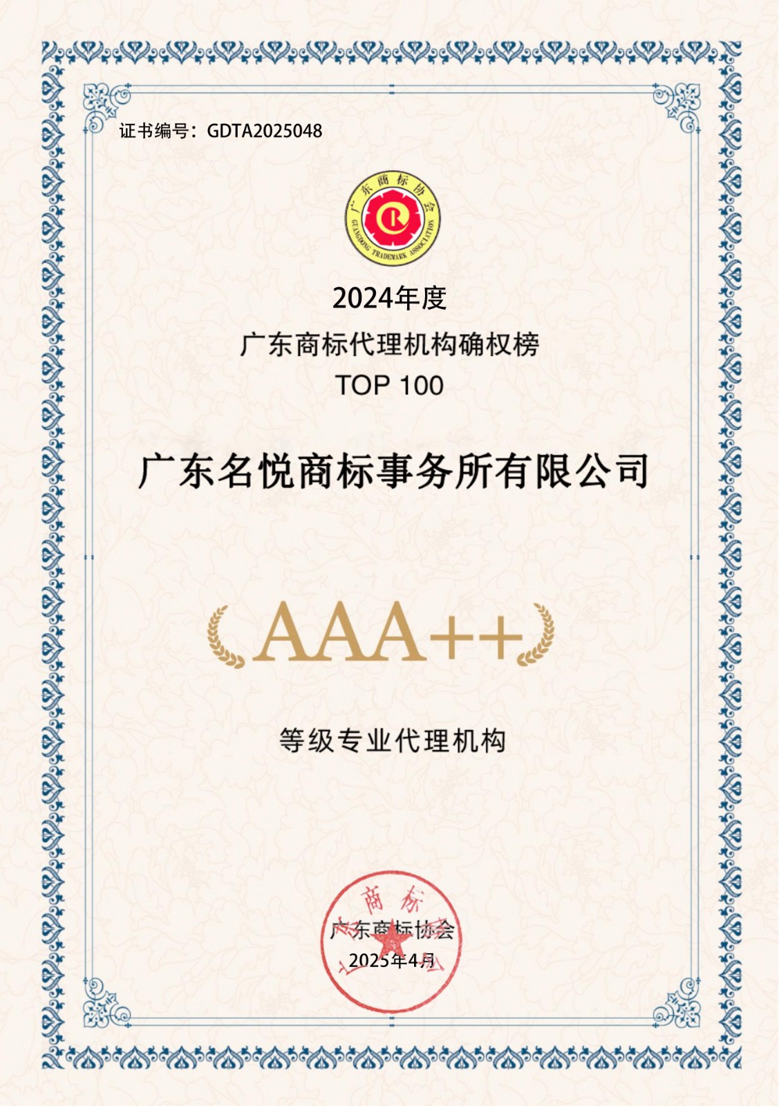 2024年度广东商标代理机构确权榜TOP100-AAA++30家证书下载