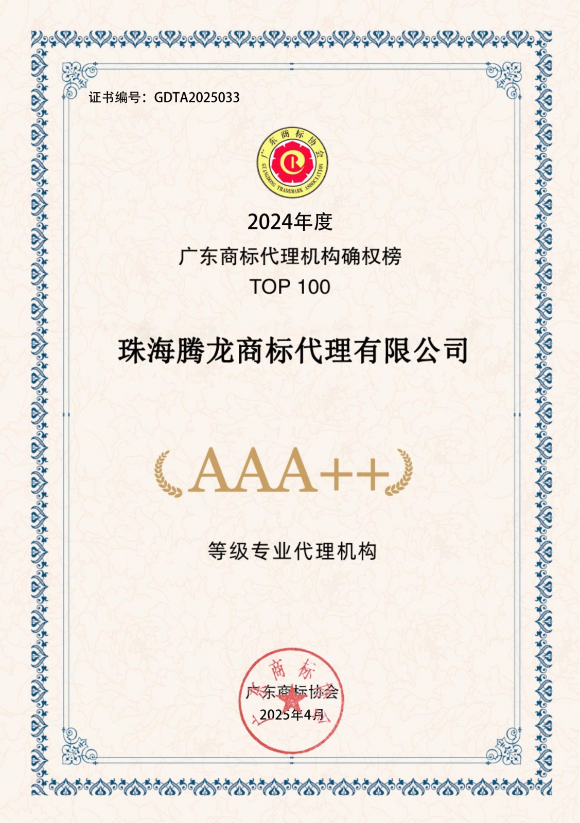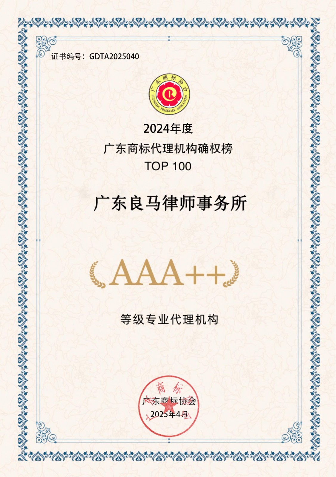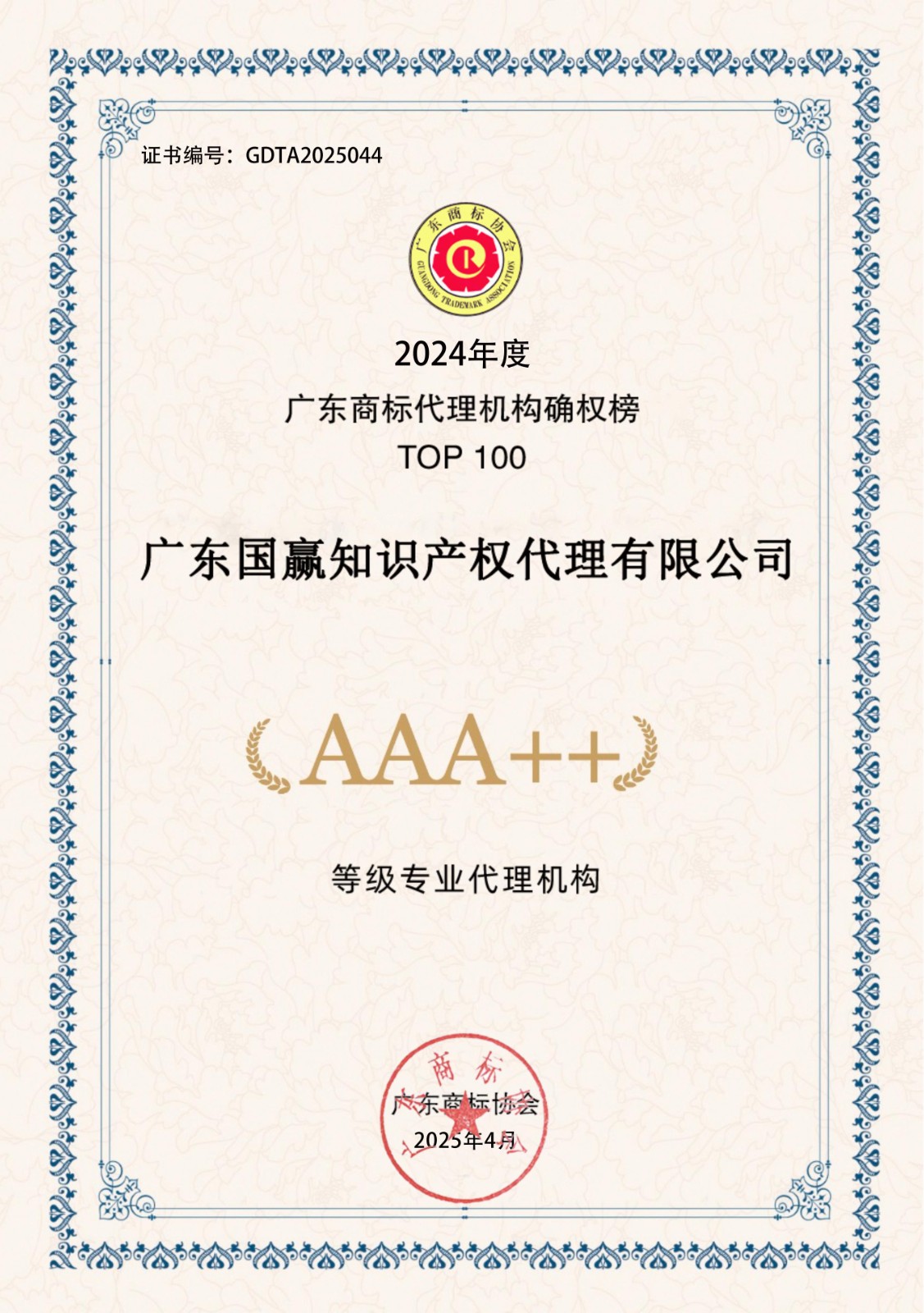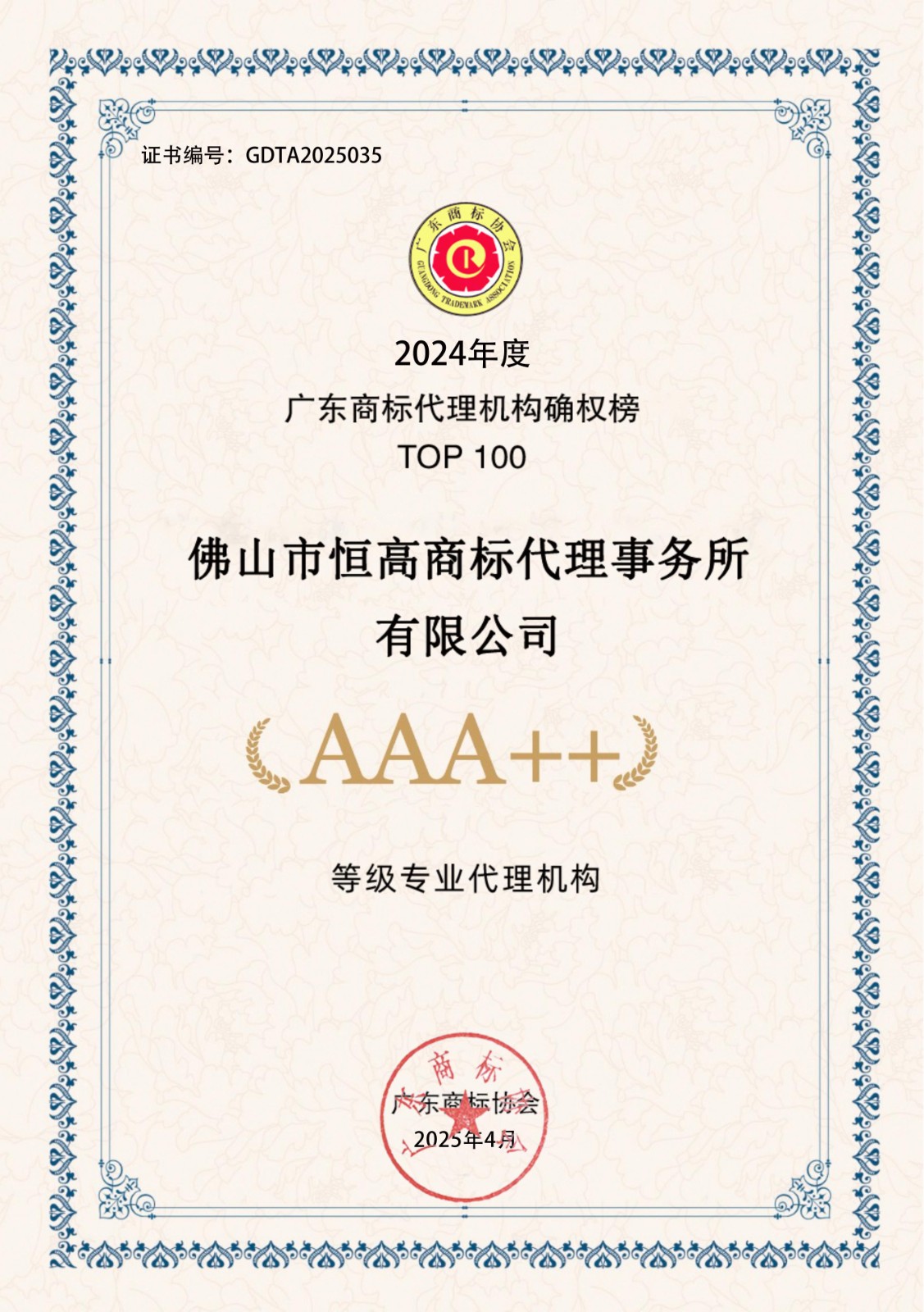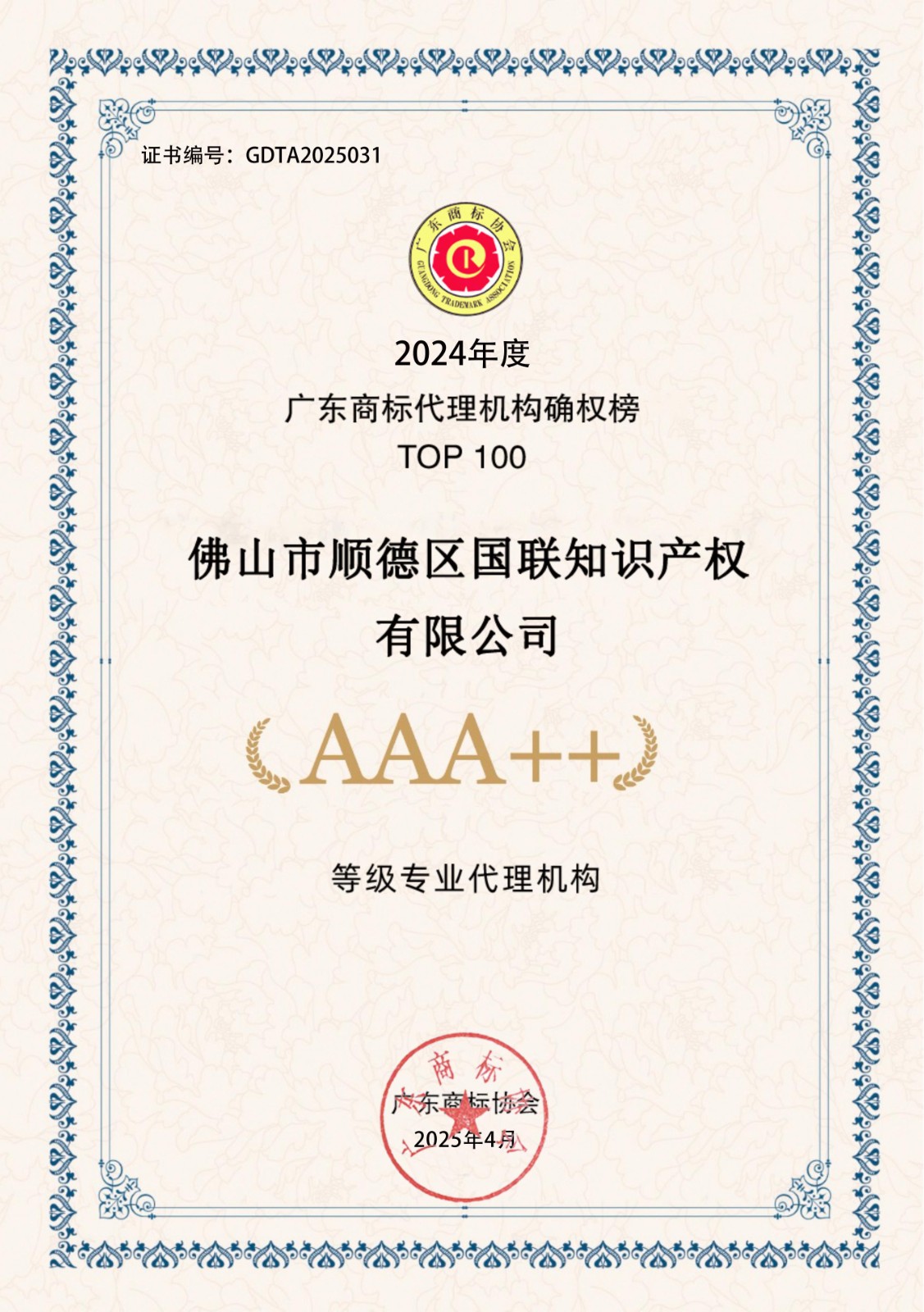 2024年度广东商标代理机构确权榜TOP100-AAA++30家证书下载