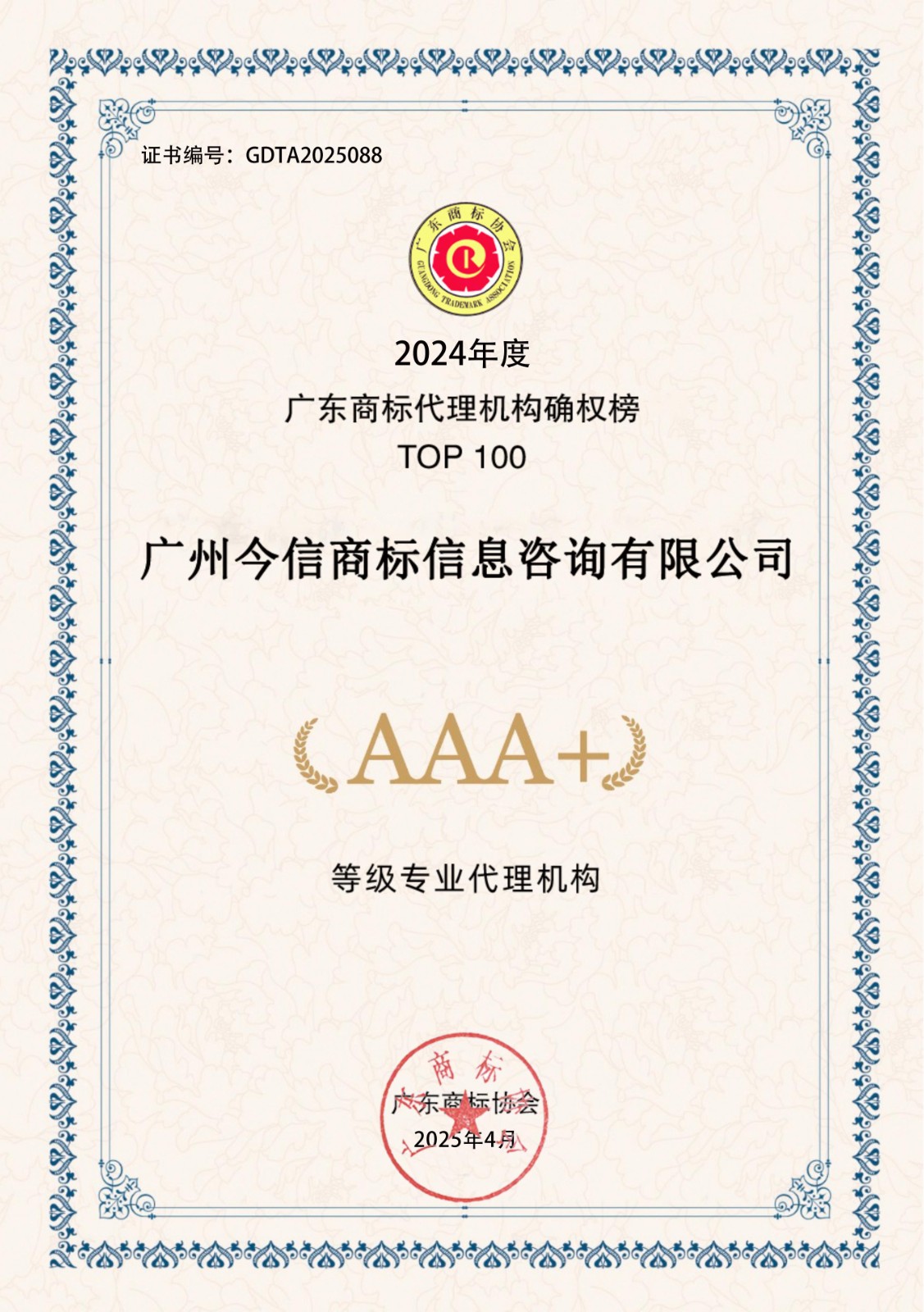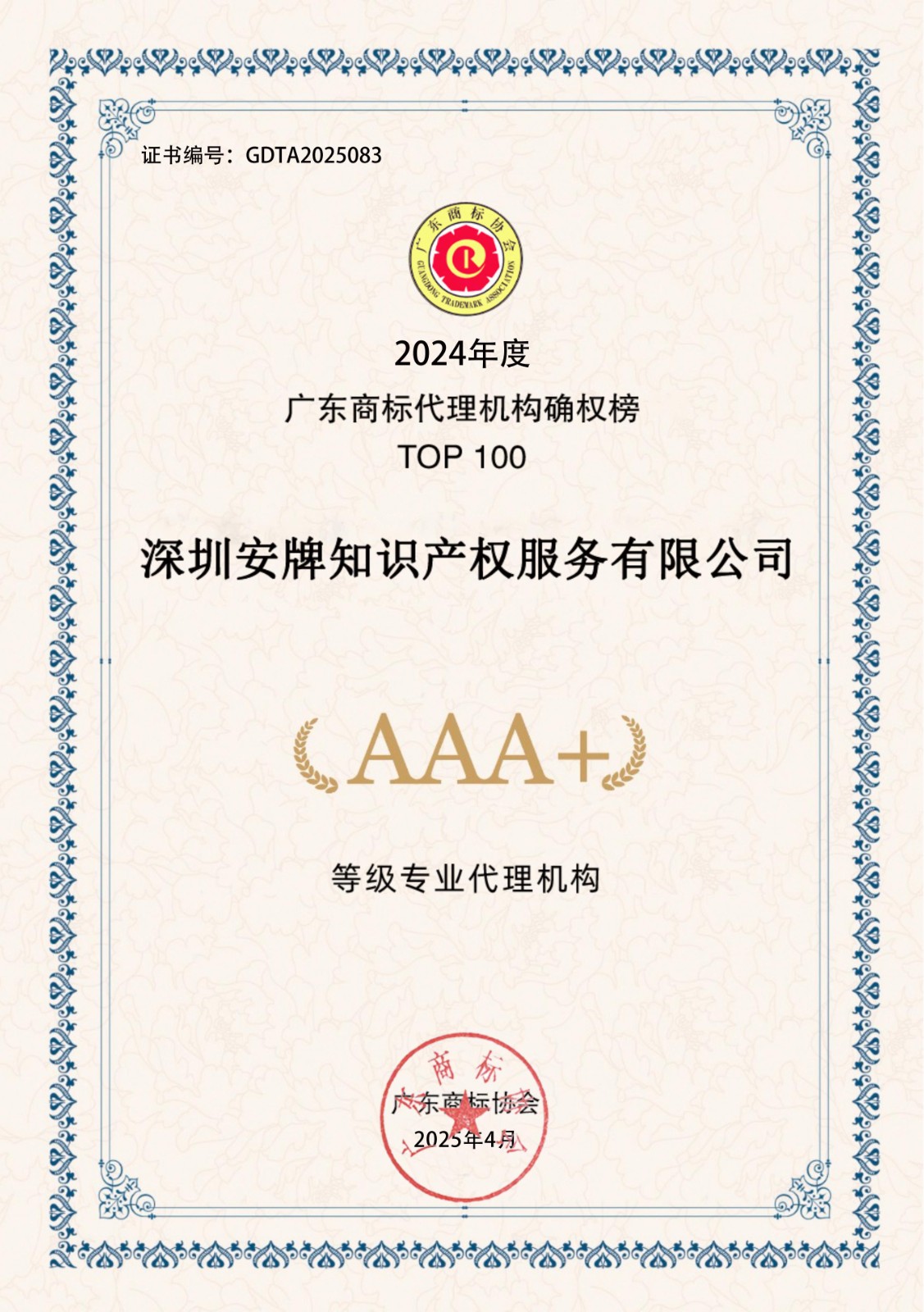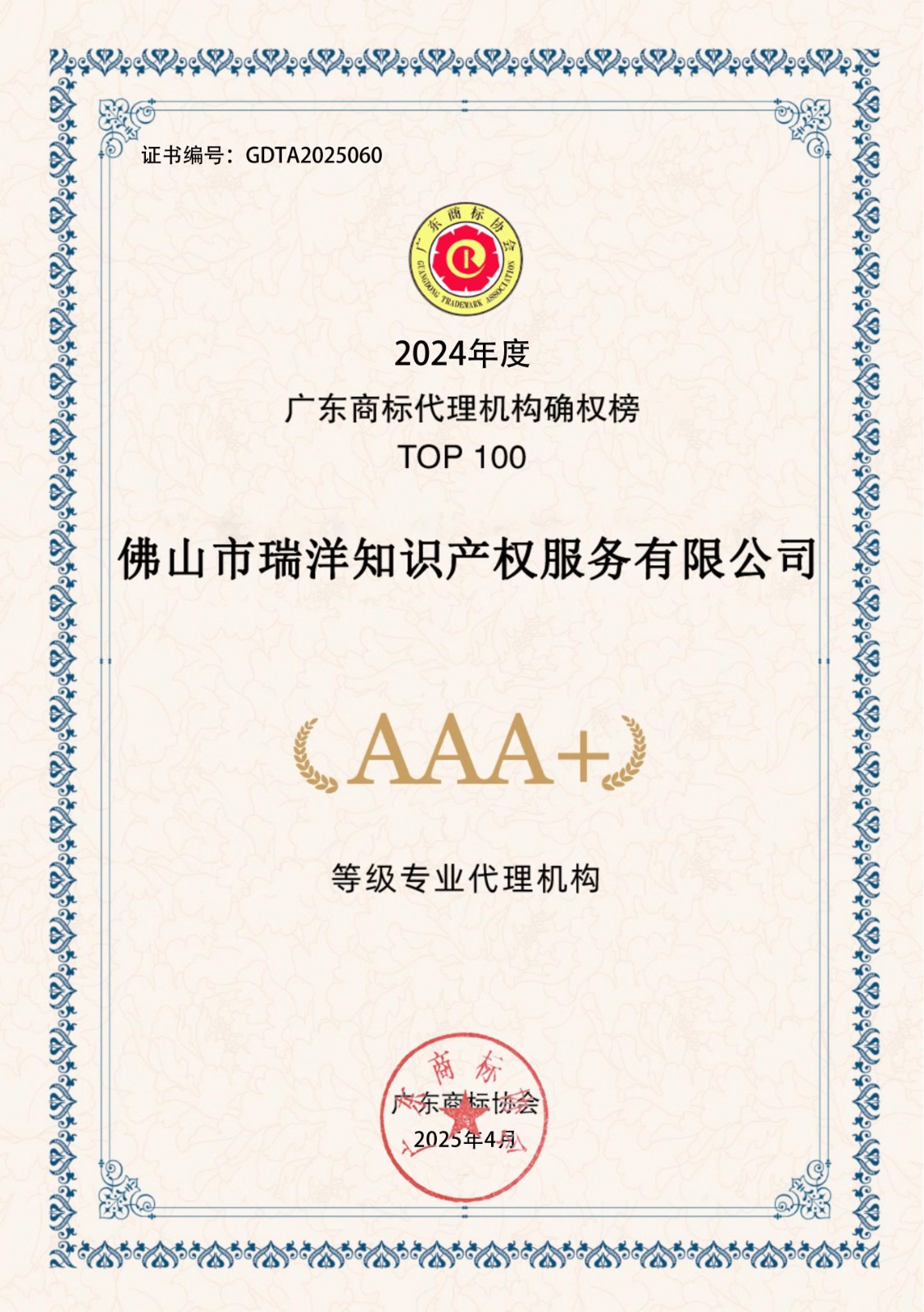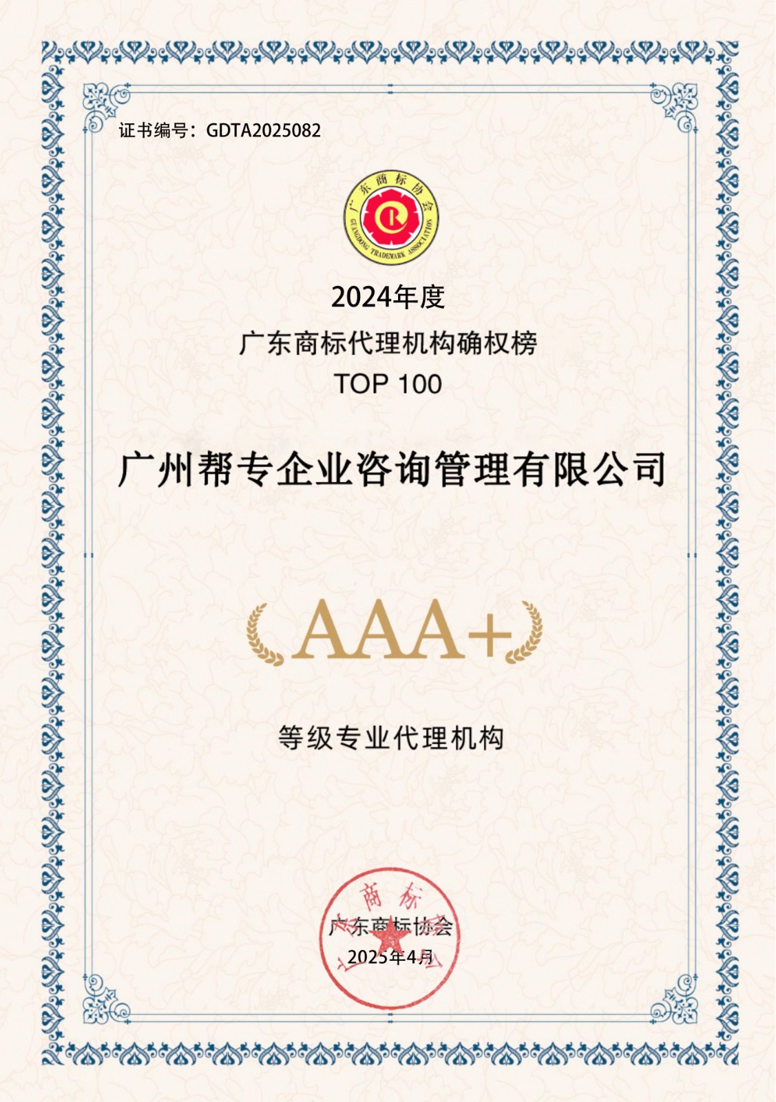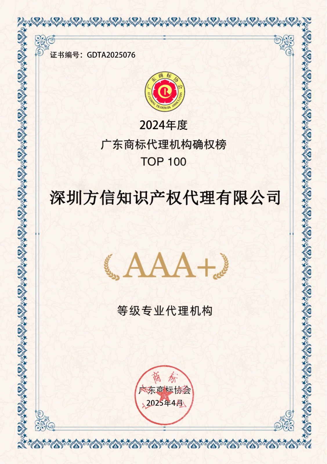 2024年度广东商标代理机构确权榜TOP100-AAA+50家证书下载