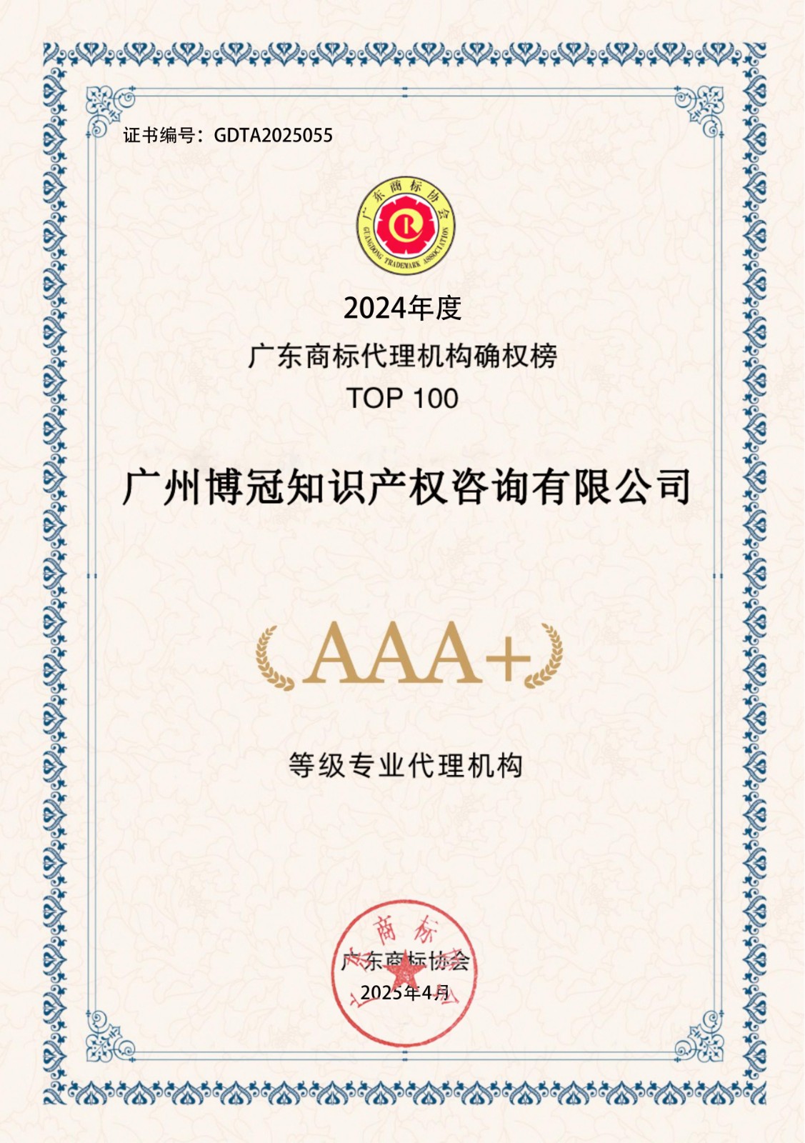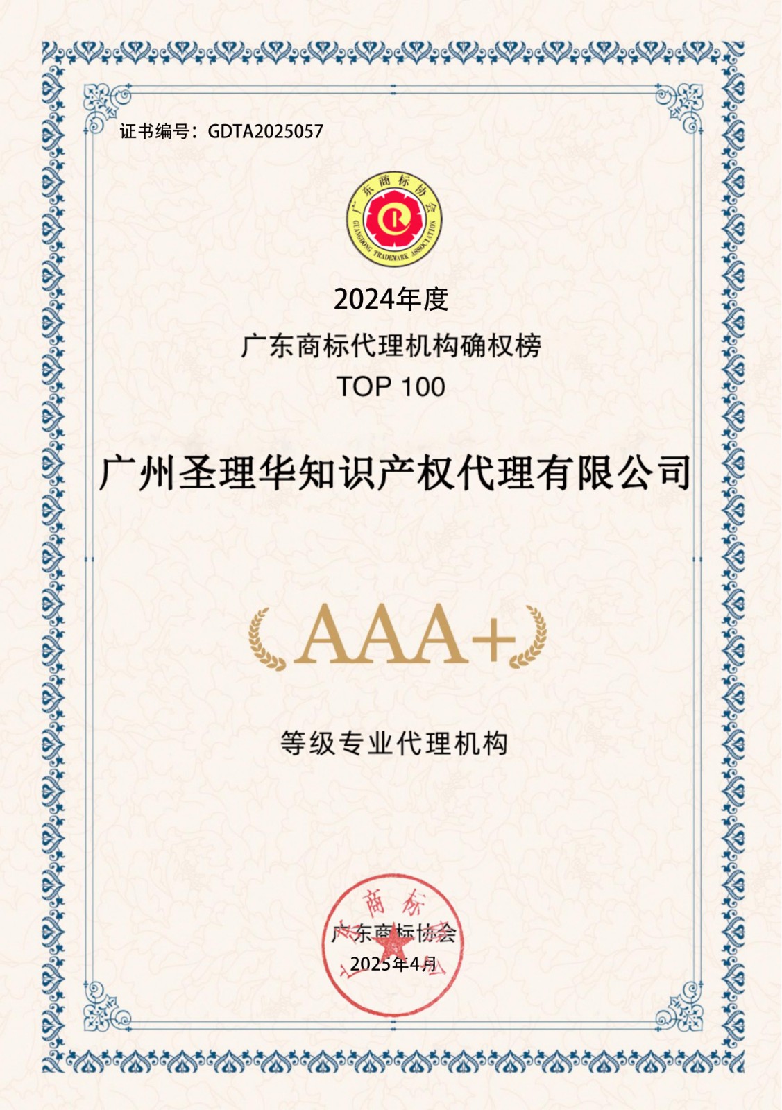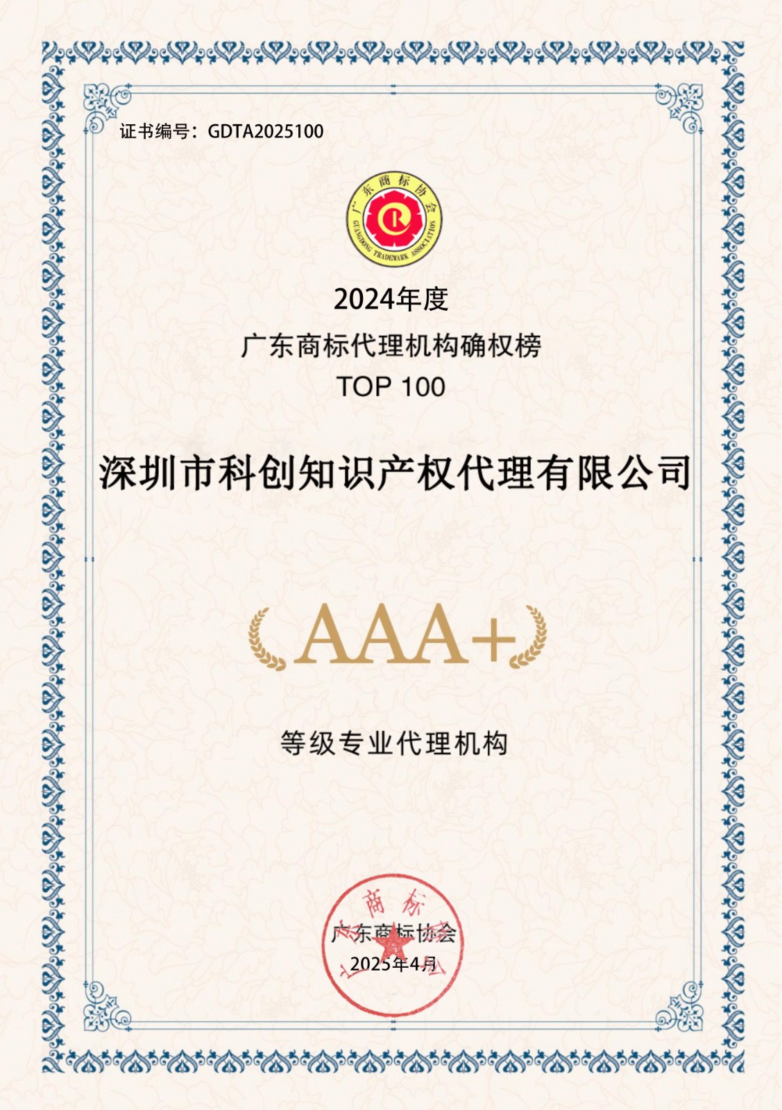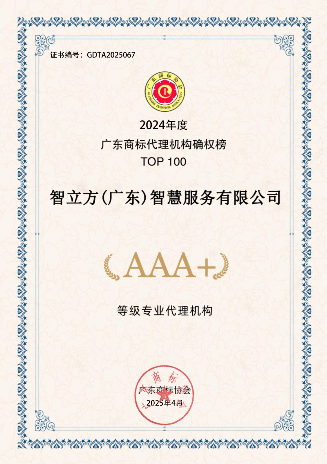 2024年度广东商标代理机构确权榜TOP100-AAA+50家证书下载
