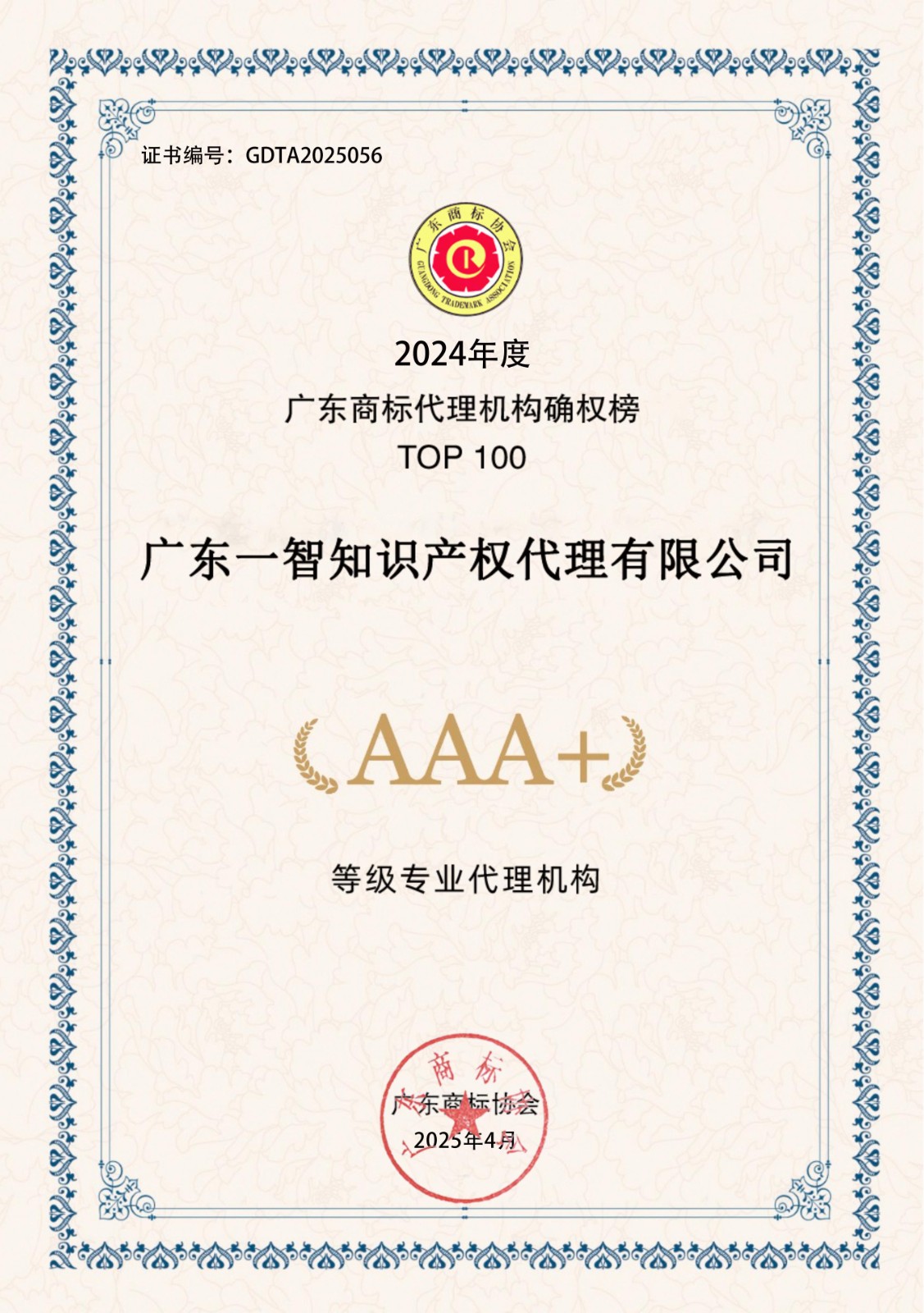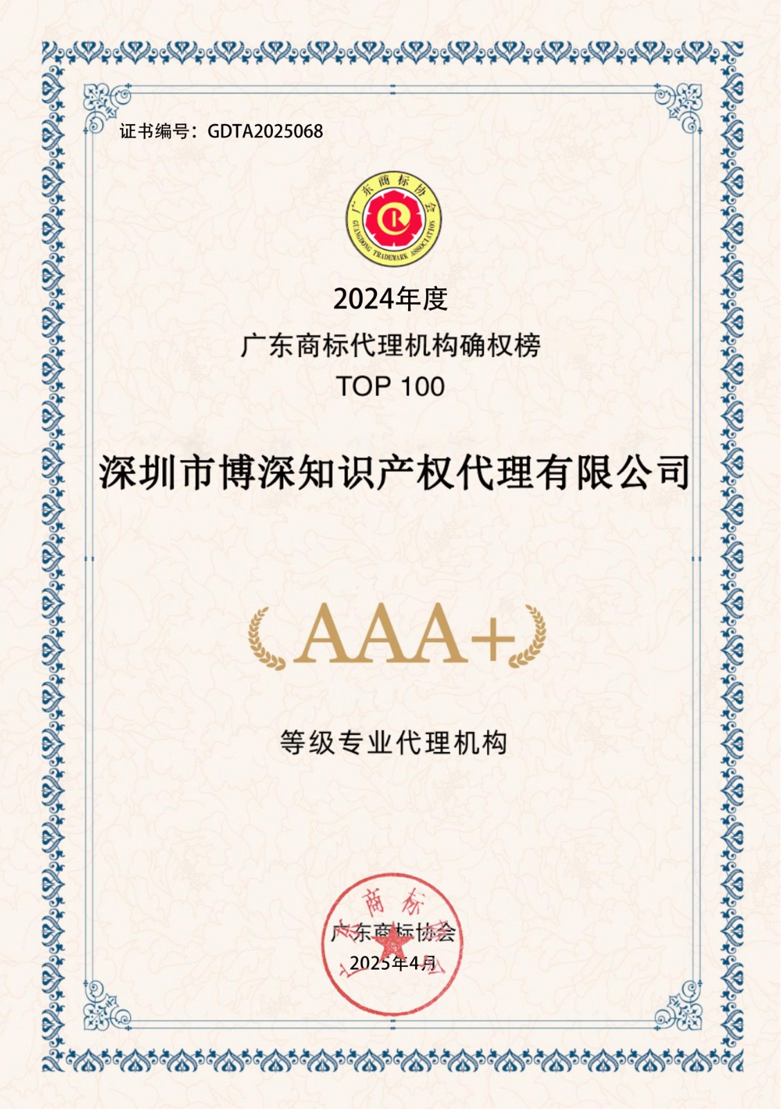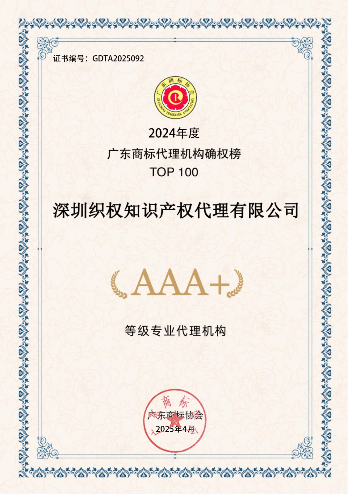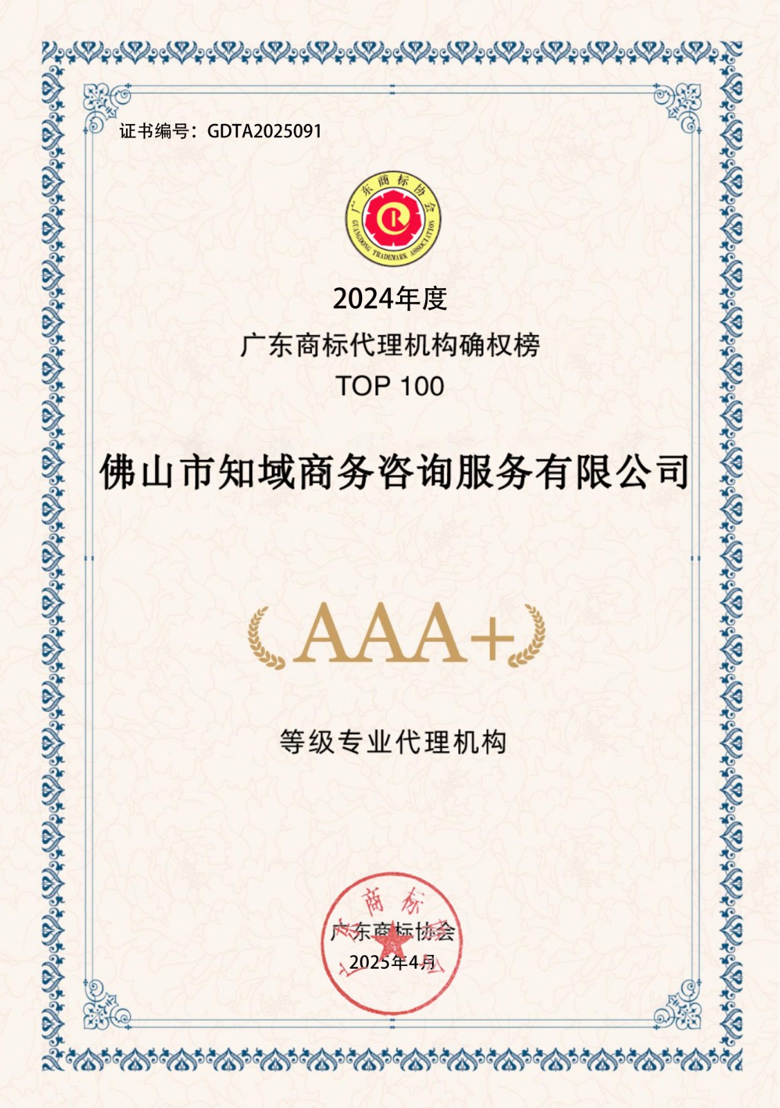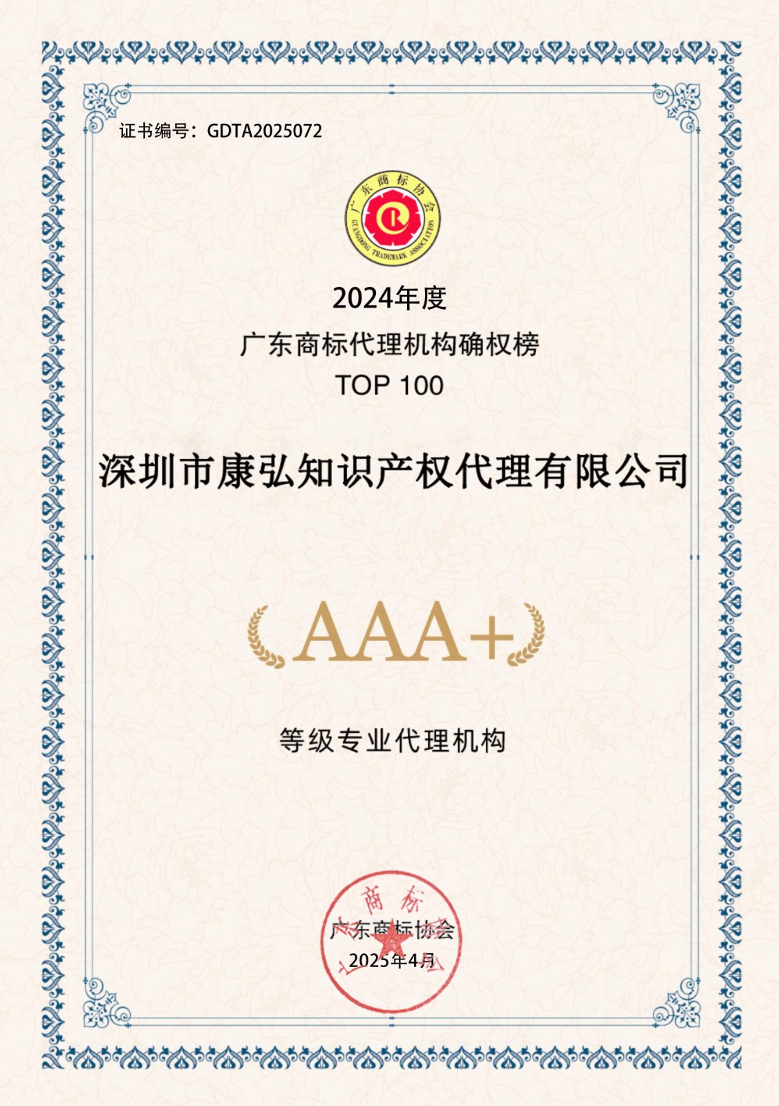 2024年度广东商标代理机构确权榜TOP100-AAA+50家证书下载