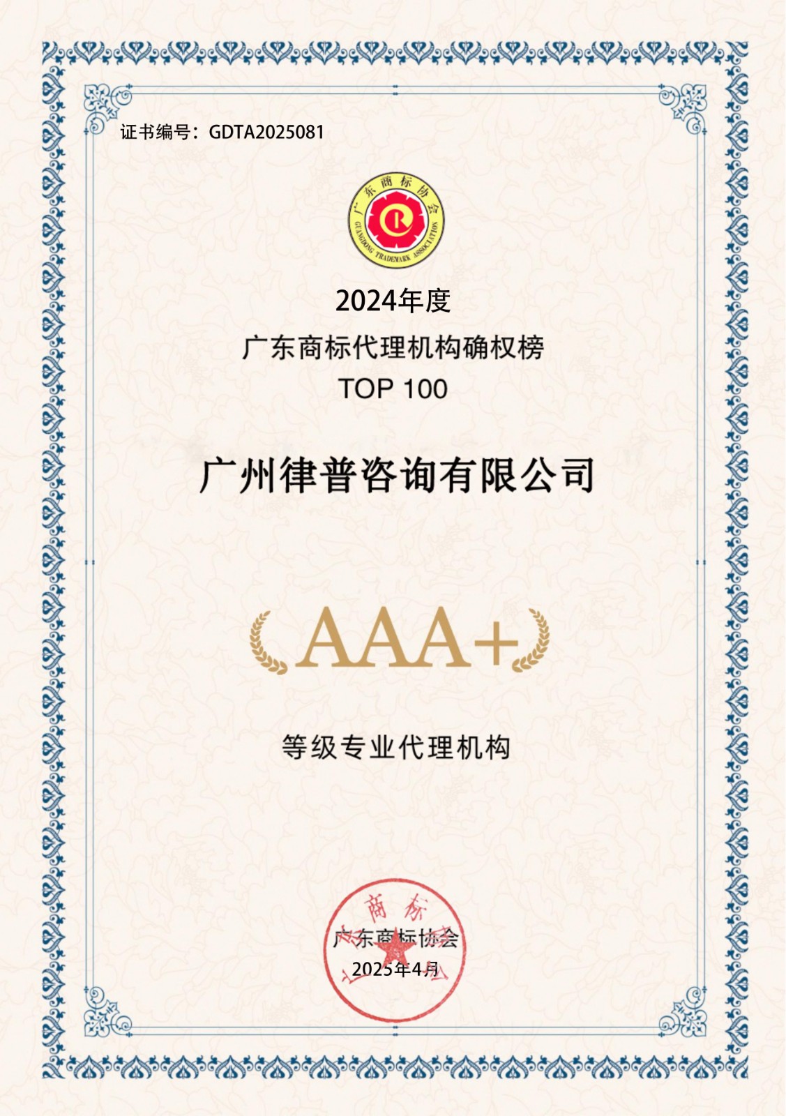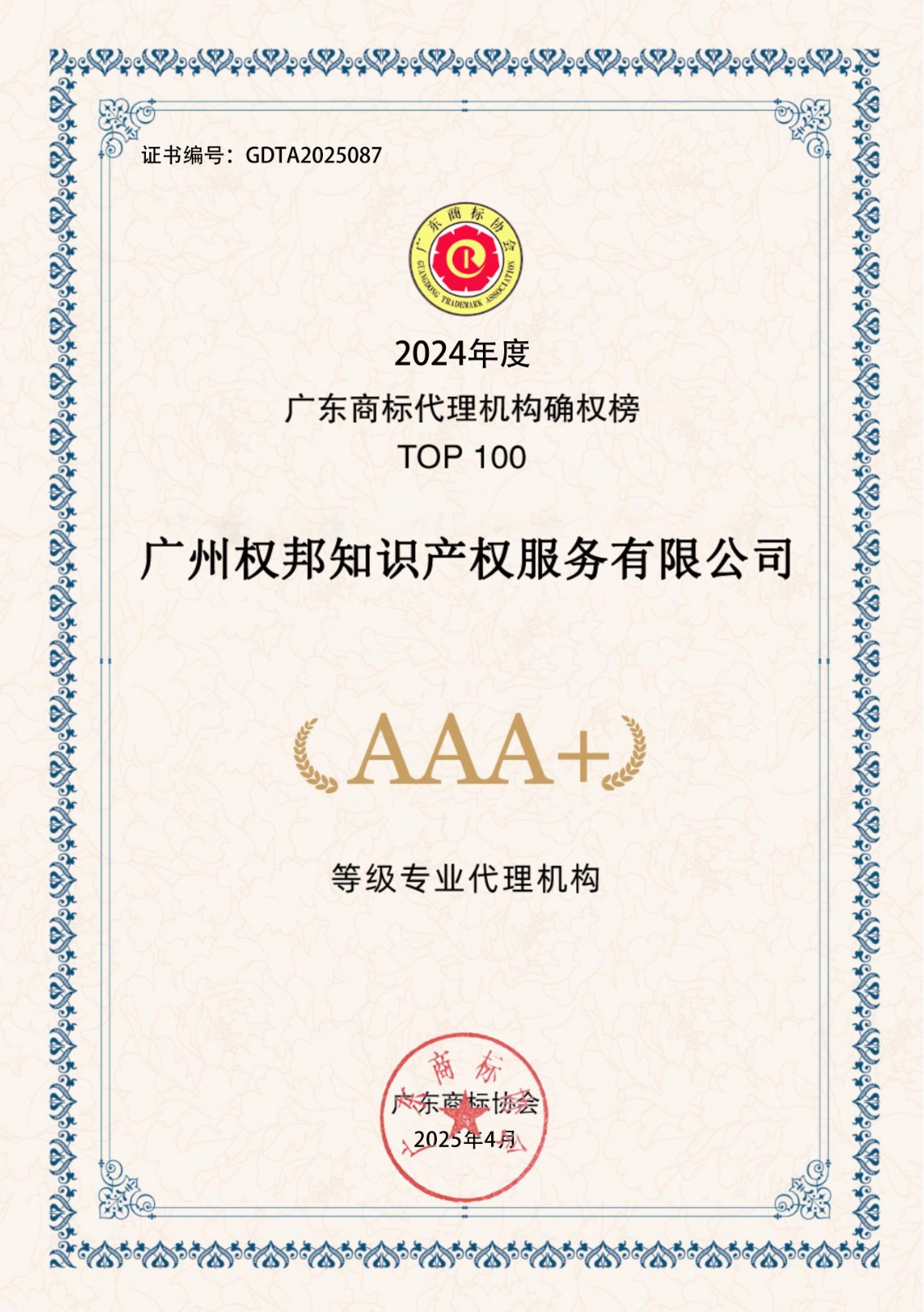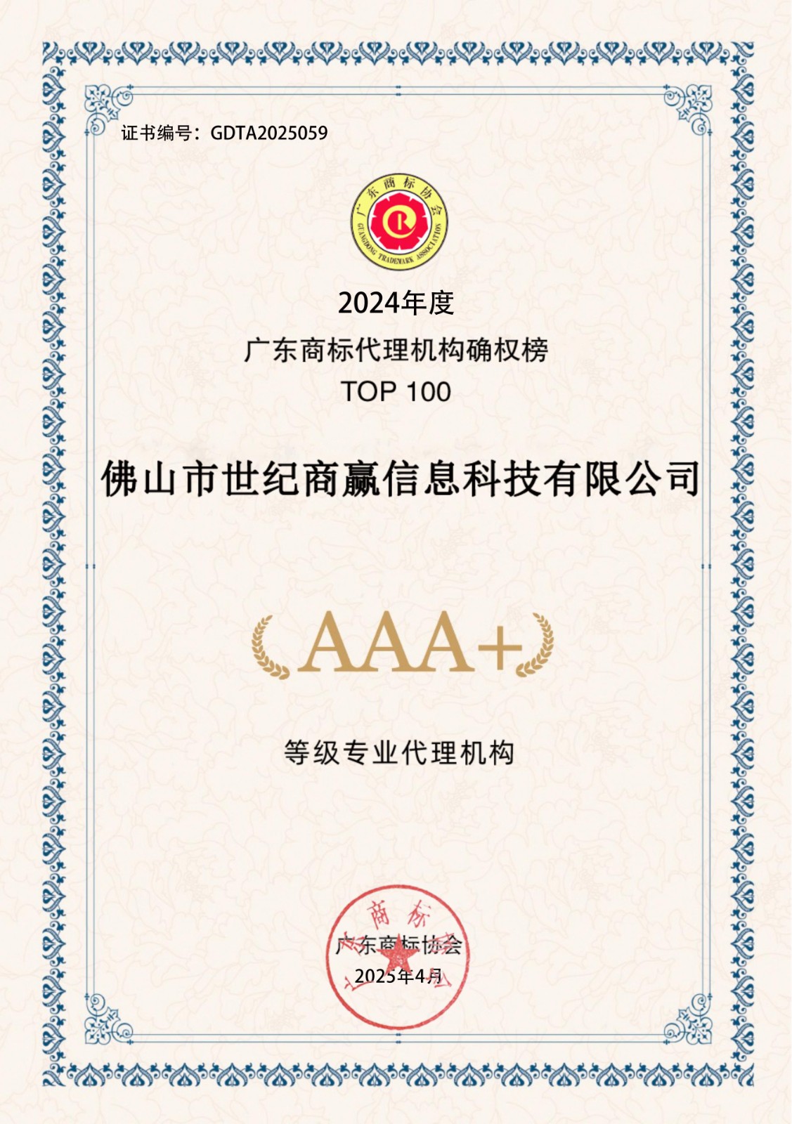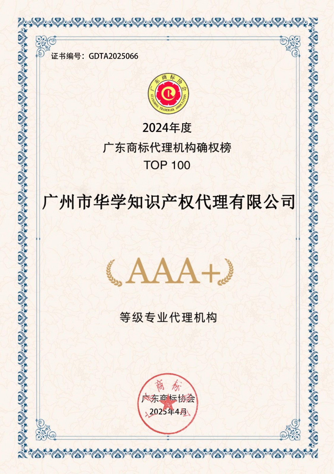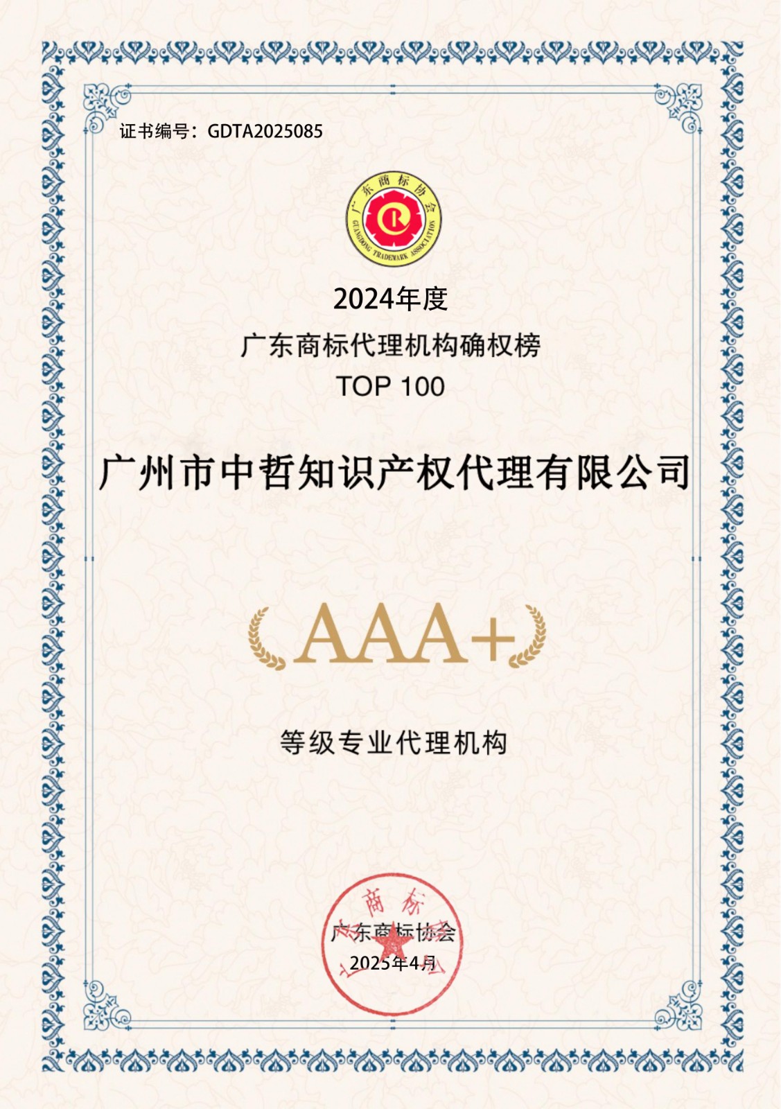 2024年度广东商标代理机构确权榜TOP100-AAA+50家证书下载