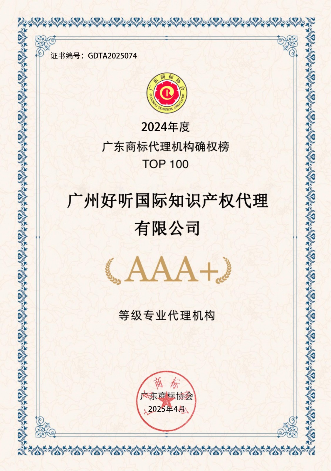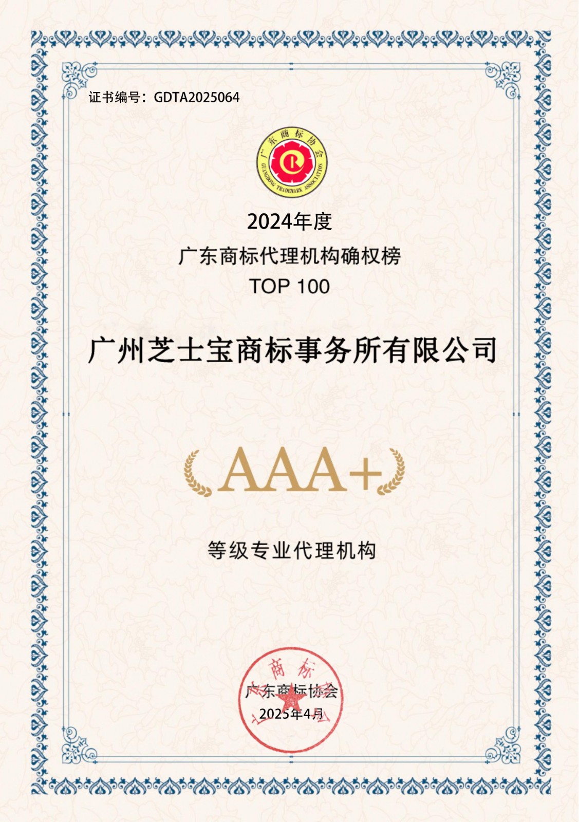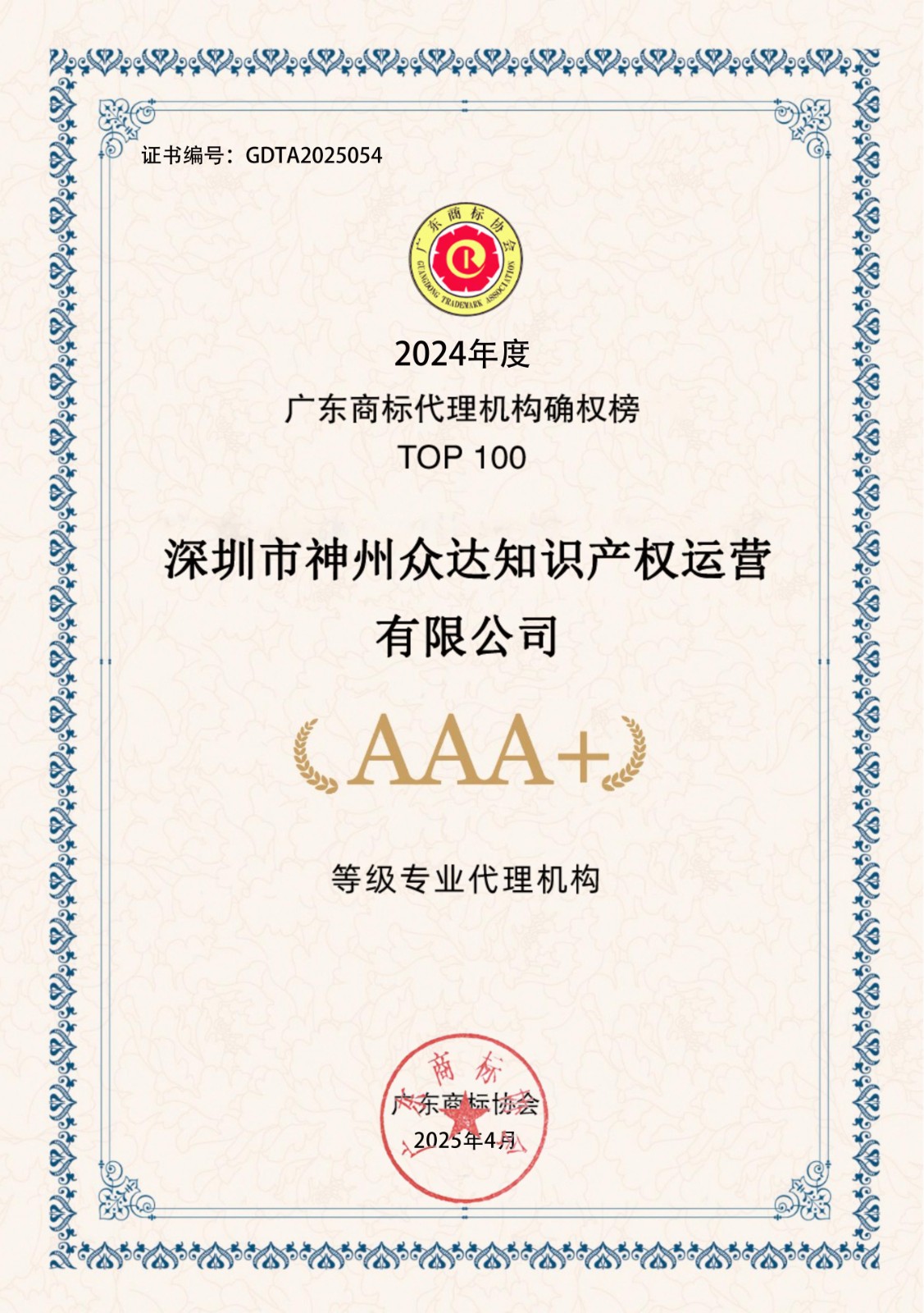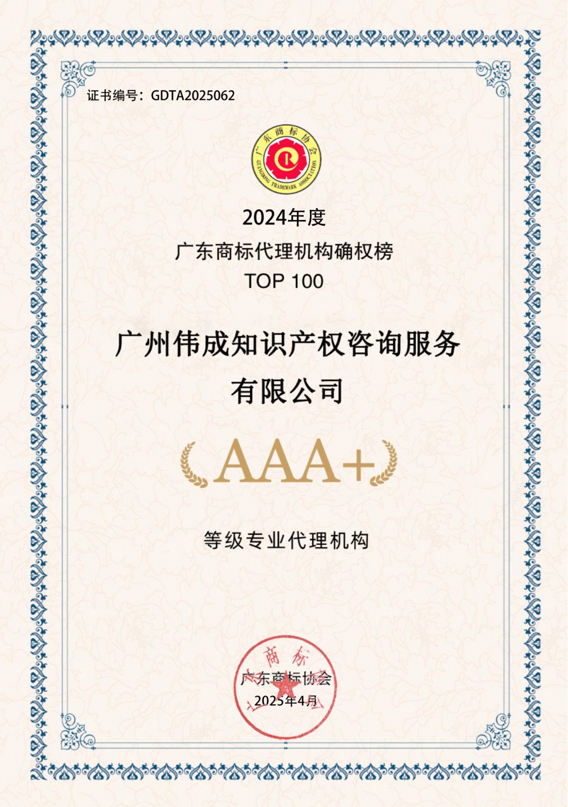 2024年度广东商标代理机构确权榜TOP100-AAA+50家证书下载
