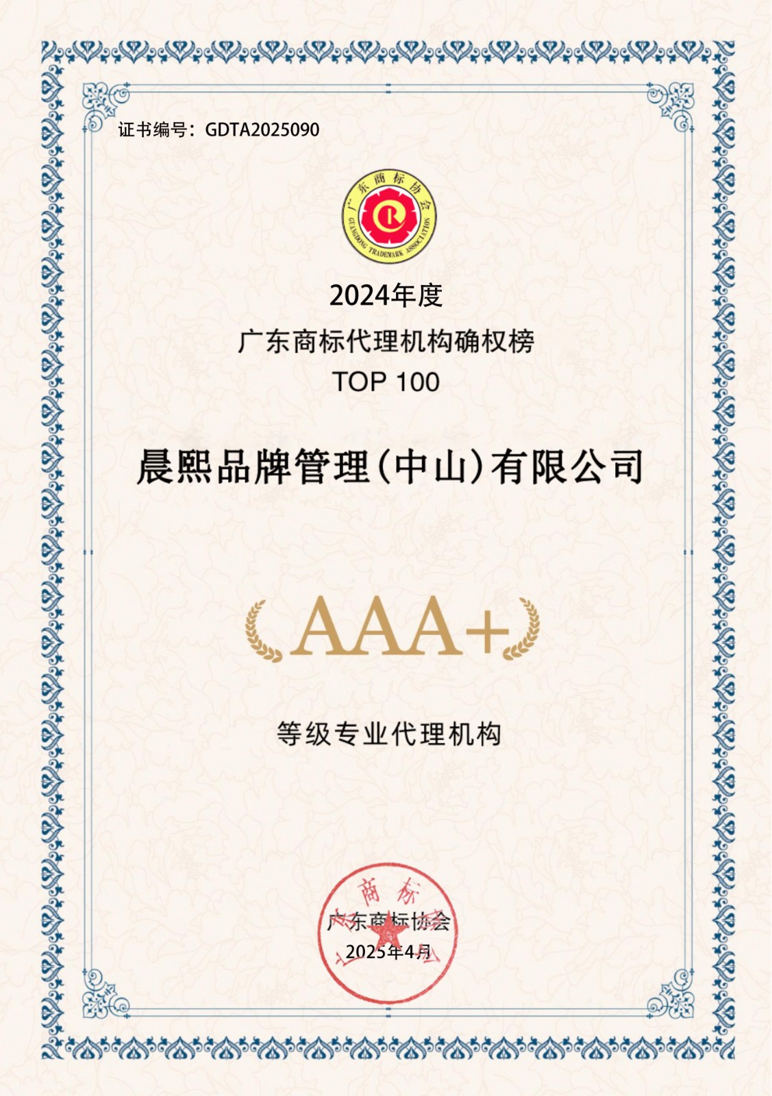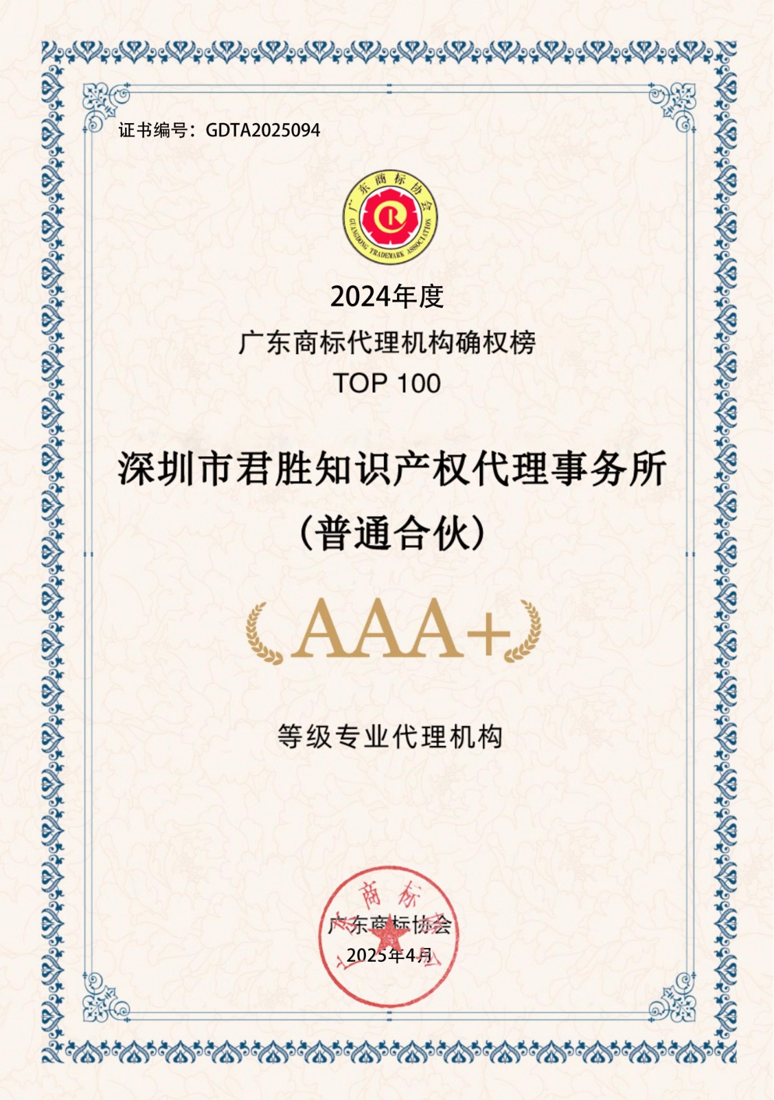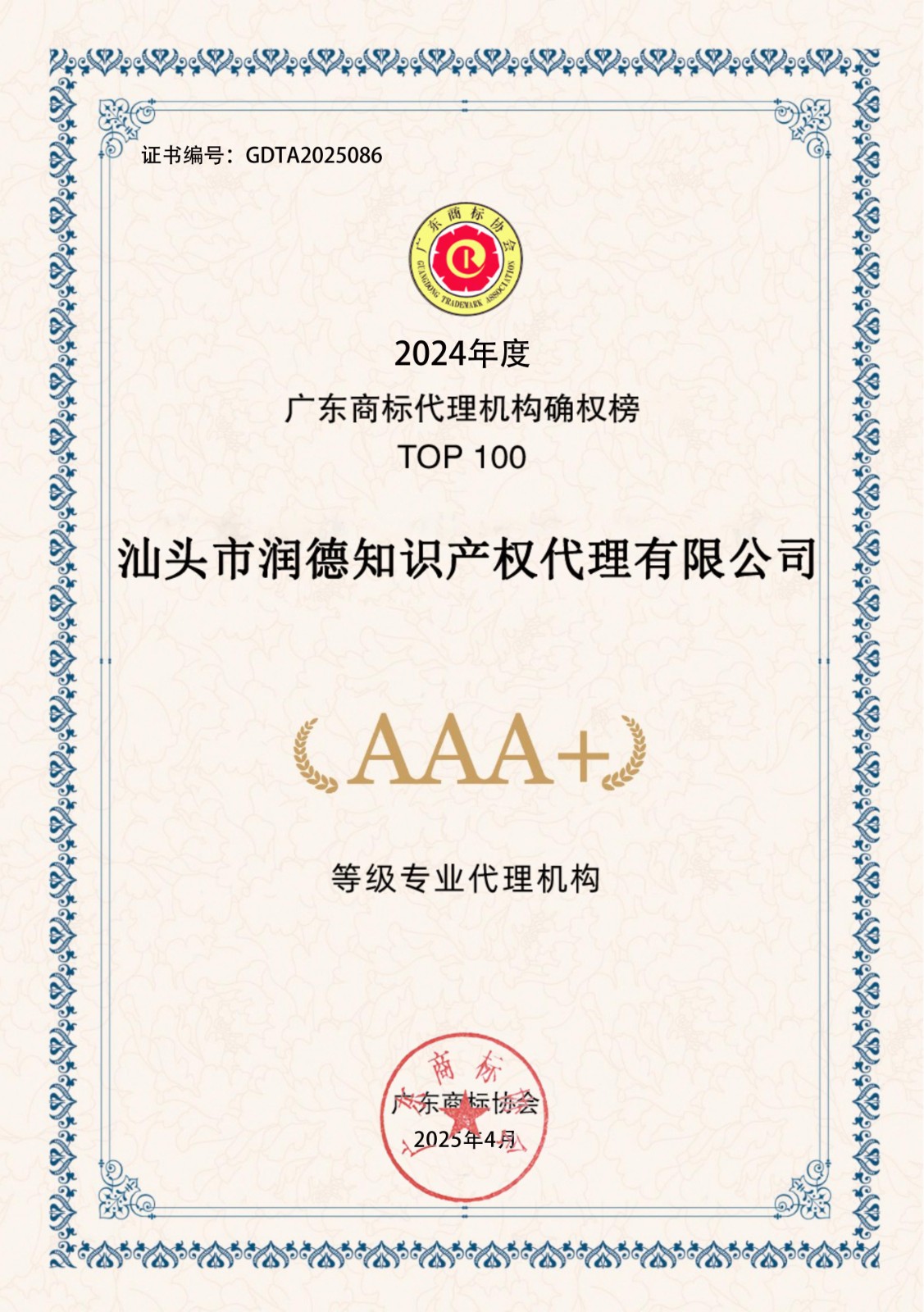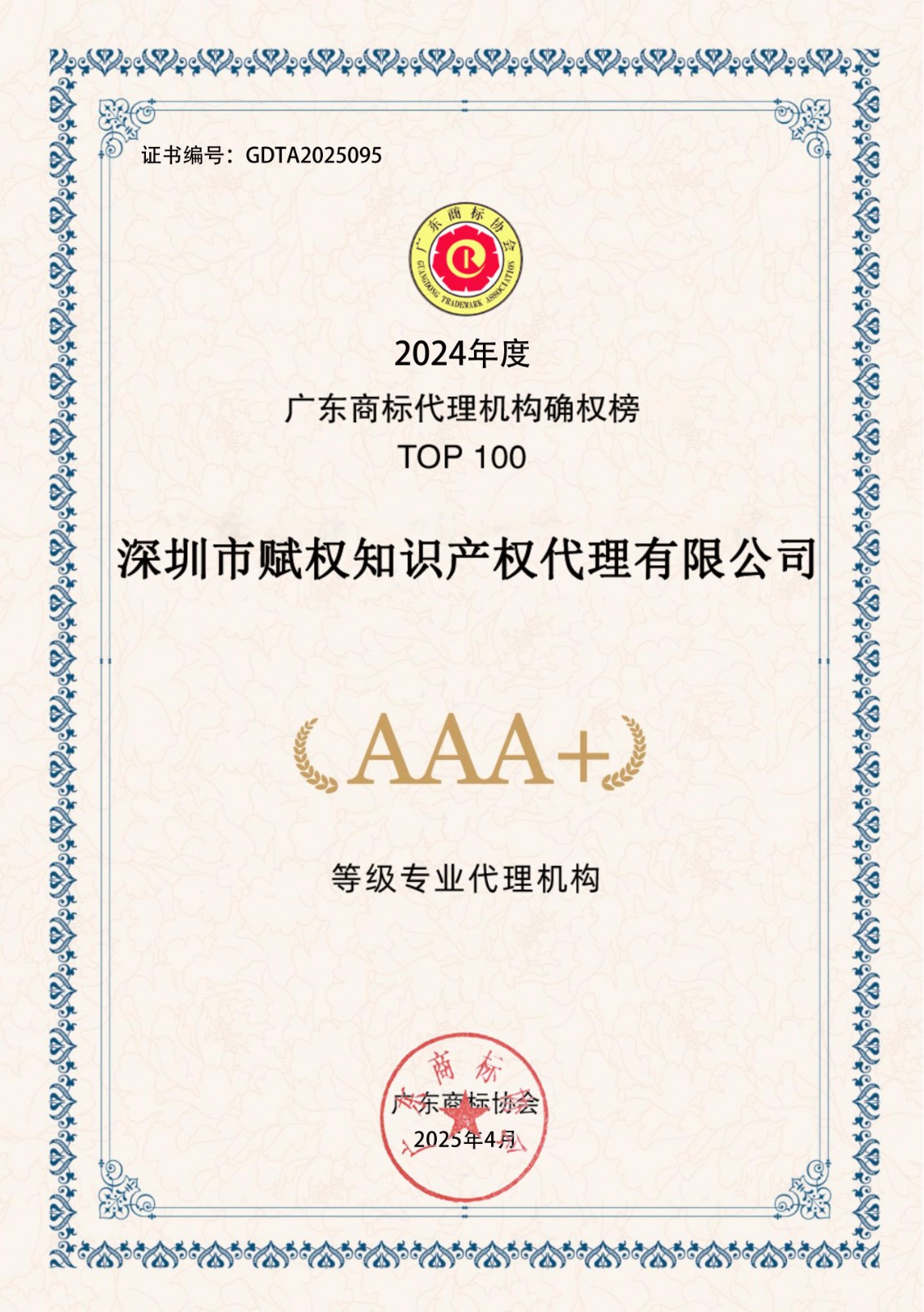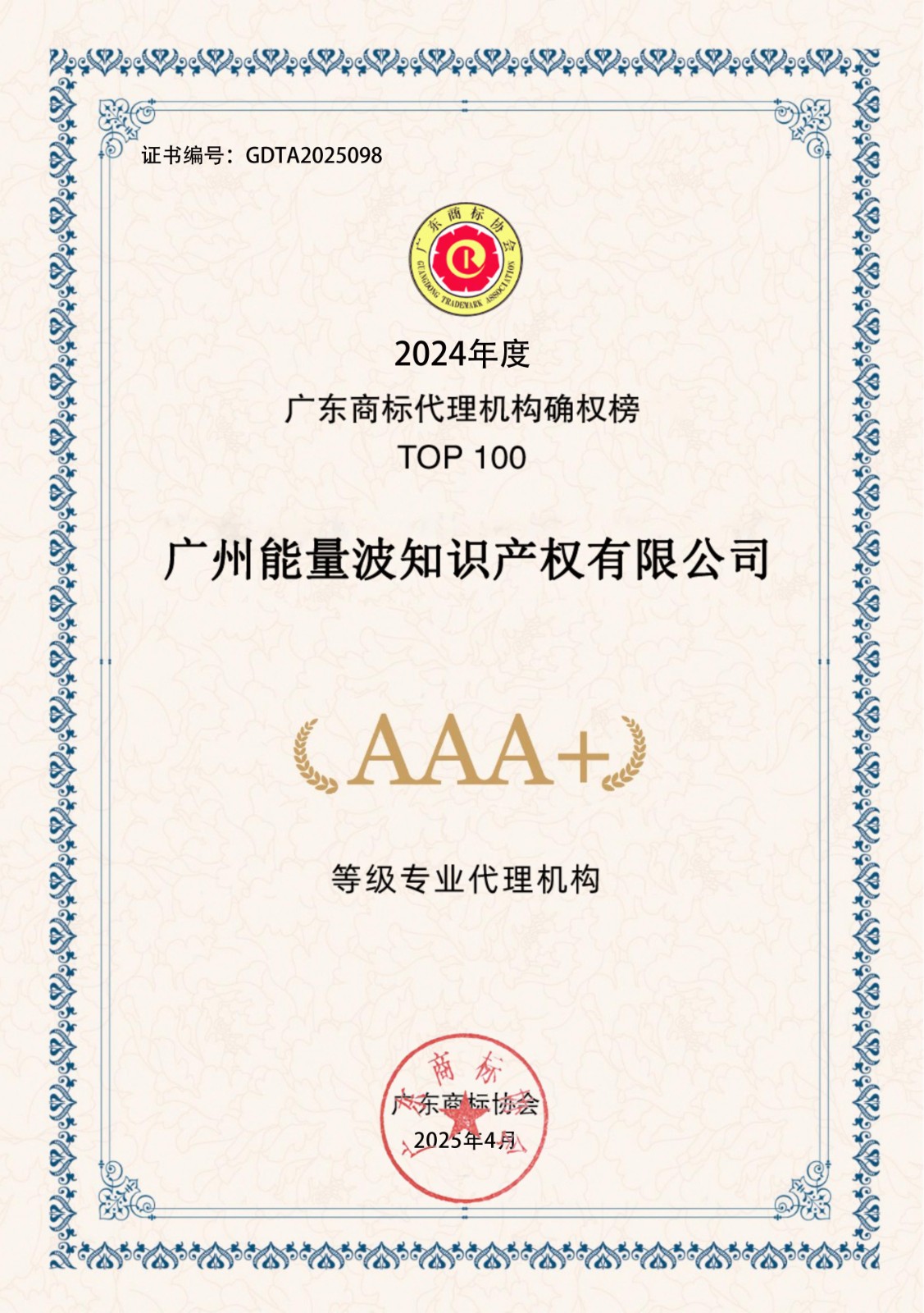 2024年度广东商标代理机构确权榜TOP100-AAA+50家证书下载