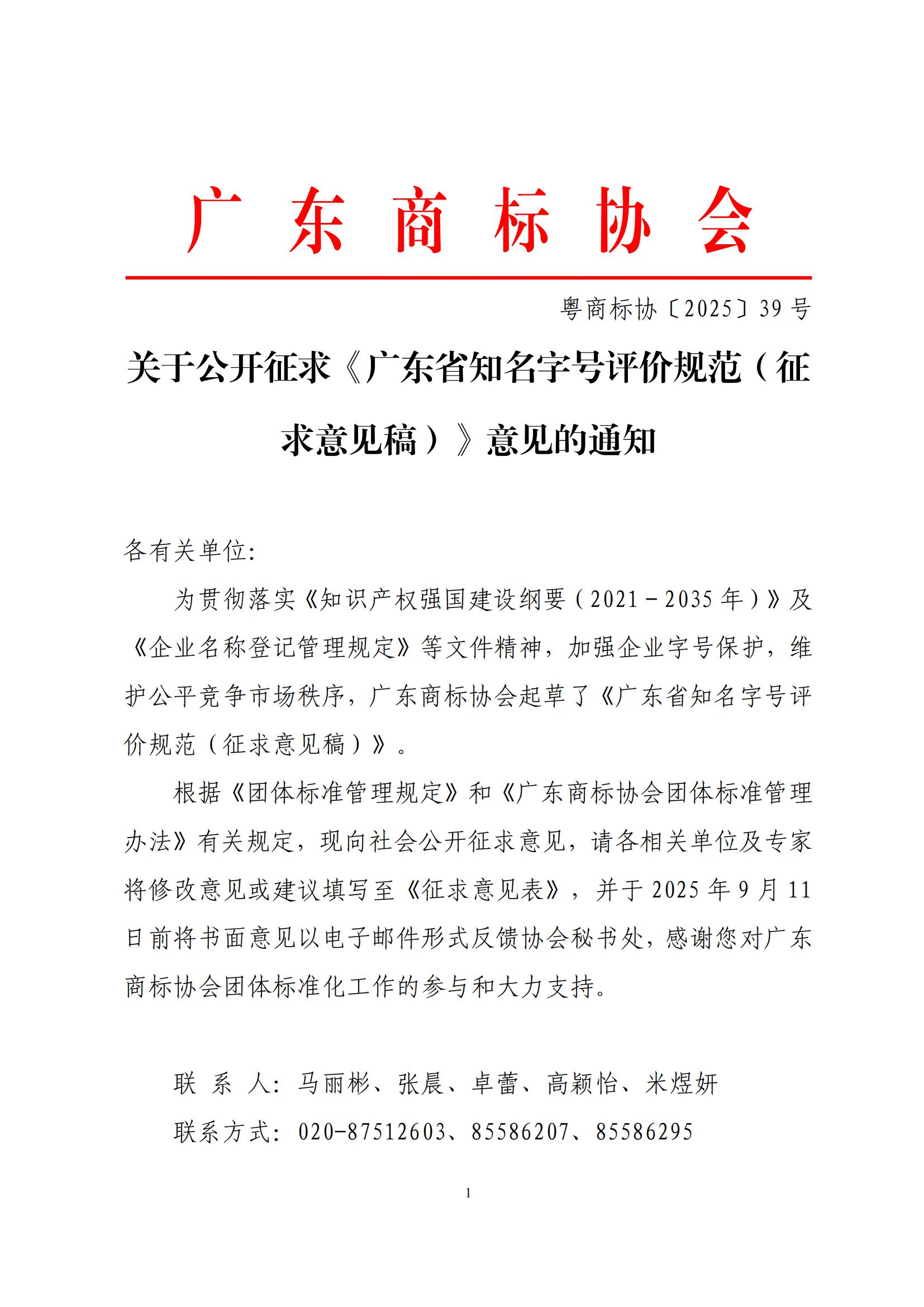 关于公开征求《广东省知名字号评价规范(征求意见稿)》意见的通知