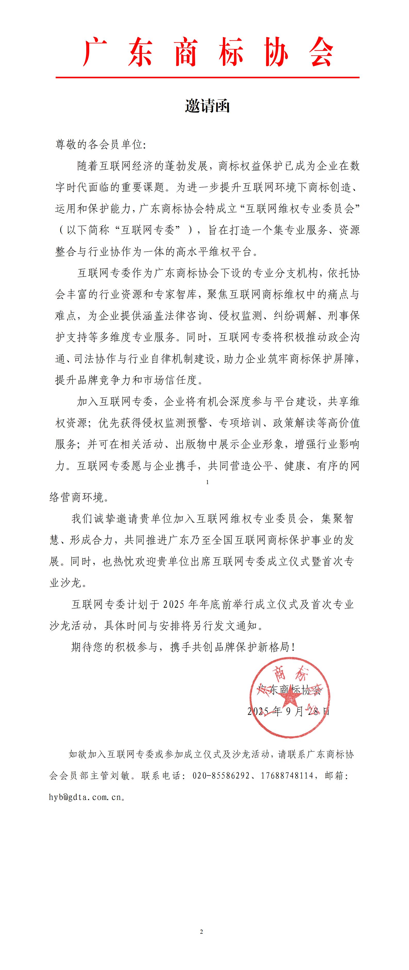 关于邀请加入广东商标协会互联网维权专业委员会的函