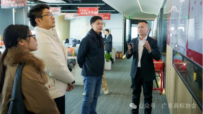 为贯彻落实《知识产权强国建设纲要(2021—2035 年)》《广东省知识产权保护和运用“十四五”规划》关于商标品牌工作的部署要求。为探索知识产权服务的新模式,促进广东企业商标保护、品牌提升和公共服务体系建设,广东商标协会依托强大资源优势,为广东商标协会会员和区域企业提供优质、高效的知识产权服务,提升广东企业商标品牌创造、运用、保护、管理能力,助推广东企业商标品牌高质量发展,广东商标协会启动强企建设商标行之开展会员企业知识产权调研走访服务。 现场参观 2024年1月23日,广东商标协会杨畔秘书长、吴臻焯副秘书长、马丽彬项目部主管等一行走访星贝知识产权指导交流,星贝知识产权创始人兼CEO李柯养(以下称老李船长)及公司代表热情接待到访。
