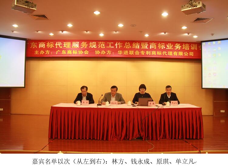 2016年3月21日,由广东商标协会主办,广州华进联合专利商标代理有限公司协办的“广东商标代理服务规范工作总结暨商标业务培训会”于广州珠江宾馆会议中心隆重举行,广东省工商行政管理局副局长、广东商标协会会长钱永成,广东省工商行政管理局商标处处长、广东商标协会常务副会长林方,广东商标协会副会长兼秘书长单立凡以及广东商标代理服务规范单位审核认定小组专家莅临指导,同时本会特邀了国家工商行政管理总局商标审查协作中心副主任原琪授课,另邀请了华进公司知识产权运营部总监聂智进行业务分享。