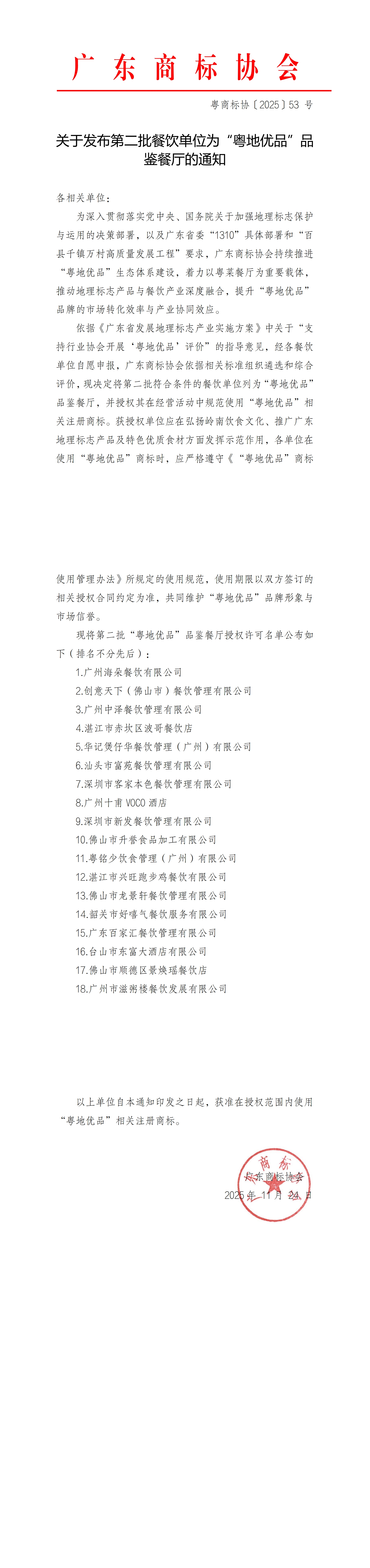 关于发布第二批餐饮单位为"粤地优品"品鉴餐厅的通知