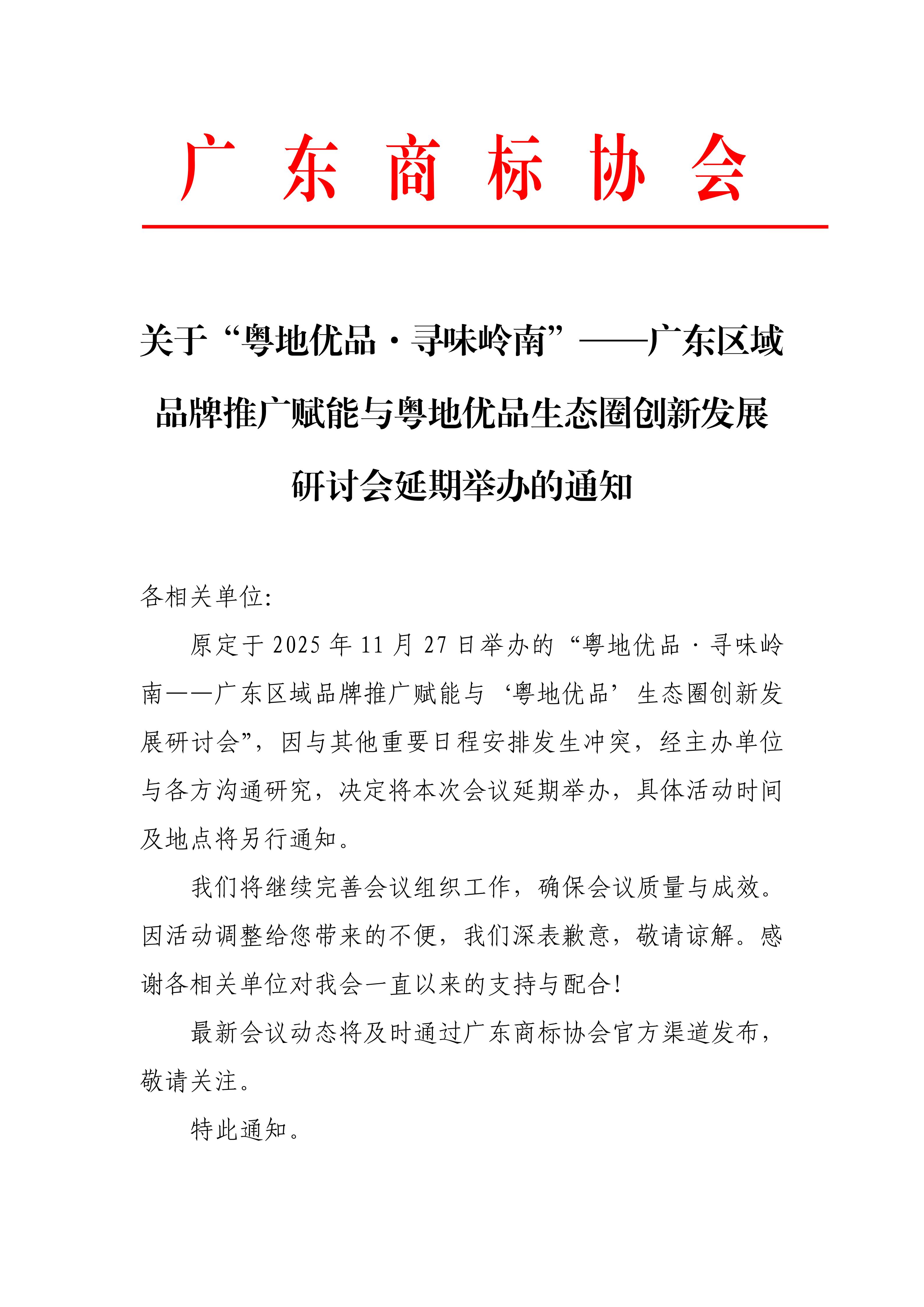 关于"粤地优品·寻味岭南"——广东区域品牌推广赋能与粤地优品生态圈创新发展研讨会延期举办的通知
