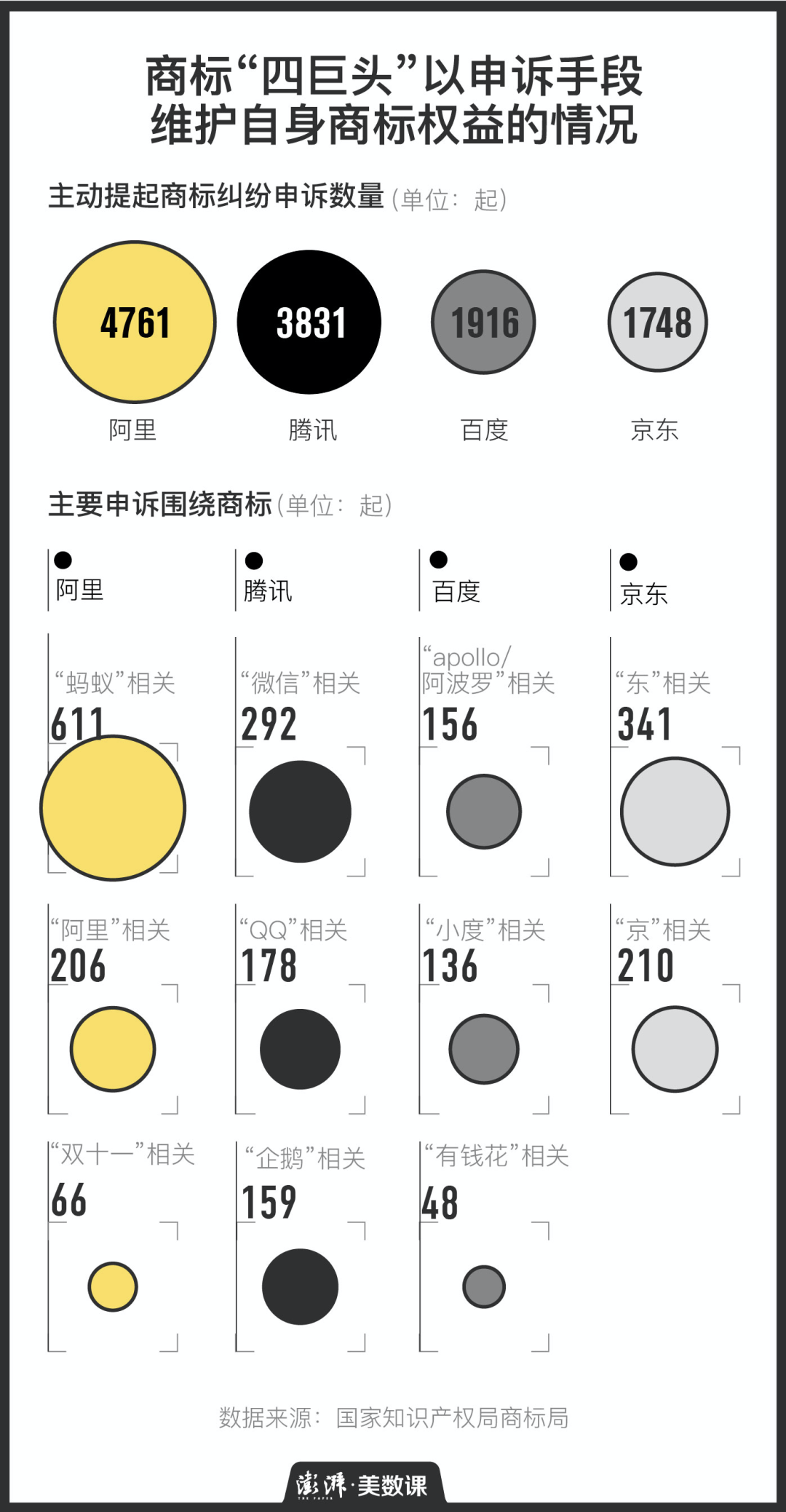以阿里、腾讯、京东、百度四家申请商标最多的互联网公司为例,他们经常向商标局申诉,要求其他公司不准使用某商标,或者是对自己申请被驳回的商标提出异议,要求商标局复审,以此来构筑自己的商标护城河。这些申诉的案例,有很大一部分属于企业成长后,发现一些常规概念产生了影响力,因此不得不争取保护的情况,比如说阿里巴巴的“蚂蚁”相关商标申诉。