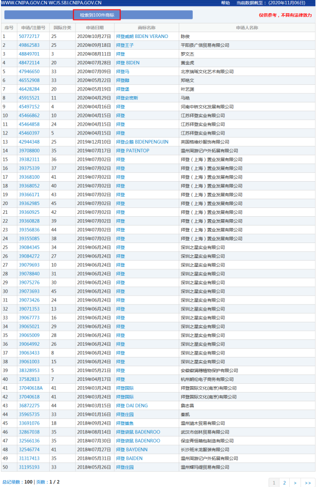 美国大选暂时尘埃落定,但忙于竞选的拜登或将创造了一个第一,即美国第一位被抢注姓名商标并且成功的美国“当选总统”。