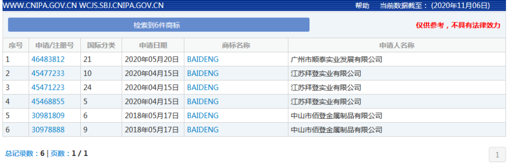 以“拜登”、“BAIDENG”作为关键词于中国商标网进行查询,可以看到截至目前已经有共计106件相关商标的申请记录。