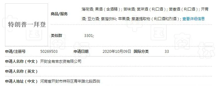 还不止如此,就在2020年美国大选进行得如火如荼的时候,竟还有人申请了“特朗普一拜登”商标,指定使用在第33类,薄荷酒,果酒(含酒精),苦味酒,茴芹酒(利口酒),茴香酒(利口酒),开胃酒, 亚力酒,蒸馏饮料,苹果酒,蒸煮提取物(利口酒和烈酒)等商品上。