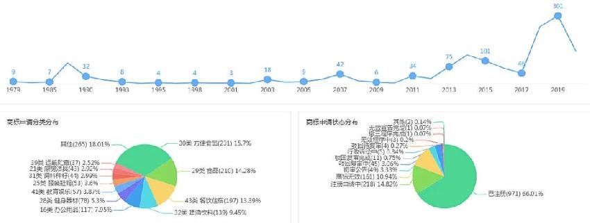 △麦当劳历年在中国申请注册的商标数和分类分布。