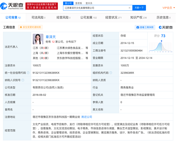 据悉,江苏章泽天文化发展有限公司由章泽天全资控股,它成立于2014年12月15日,法定代表人为章泽天,注册资本为1000万,经营范围包含文化产业投资,电视节目制作、发行,经营演出及经纪业务等。