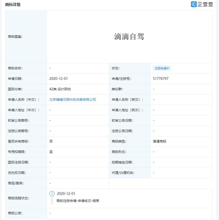 企查查 App 显示, 北京嘀嘀无限科技发展有限公司于 12 月 1 日申请了“滴滴自驾”相关商标 ,核准注册在 42 类设计研究品类中。