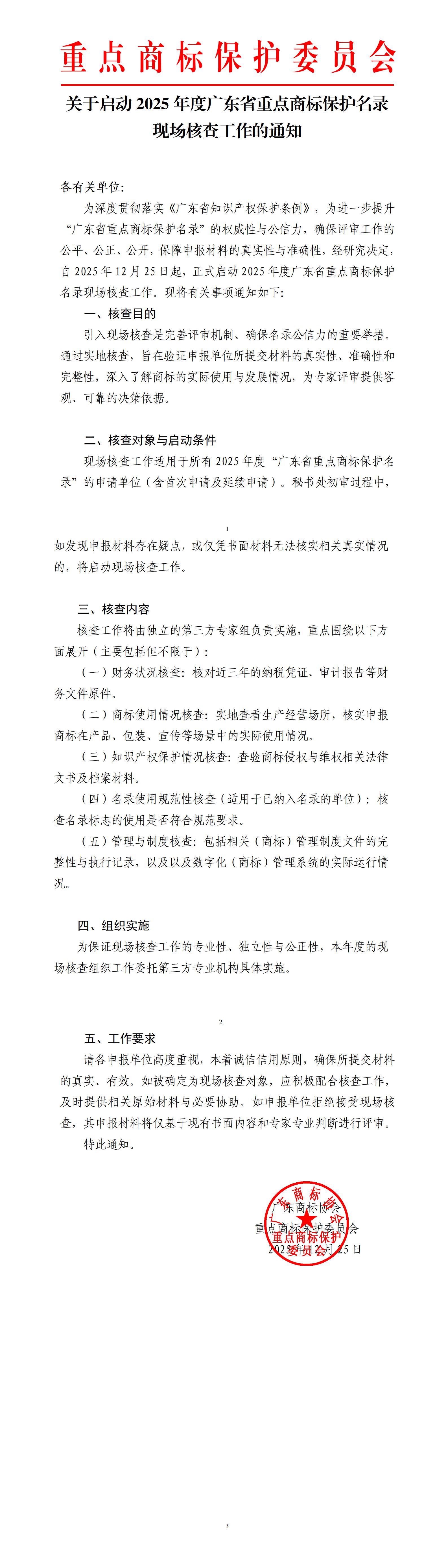 关于启动2025年度广东省重点商标保护名录现场核查工作的通知